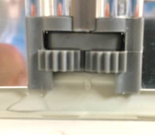 Water comes down the glass screen panels then passes through/over/around etc the rotating plastic gears that allow the screen to fold away etc.