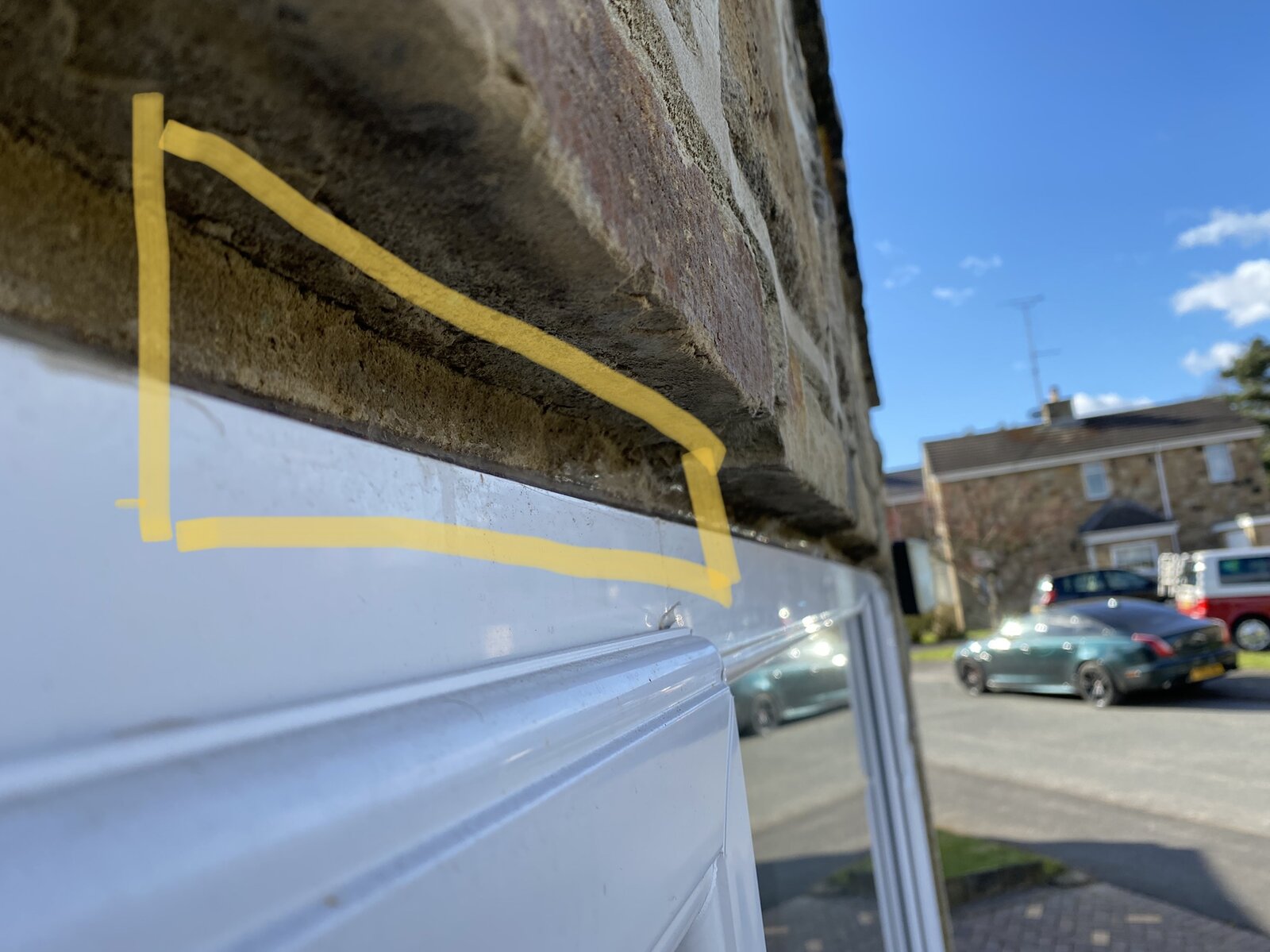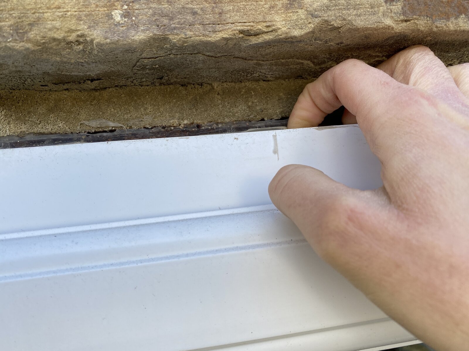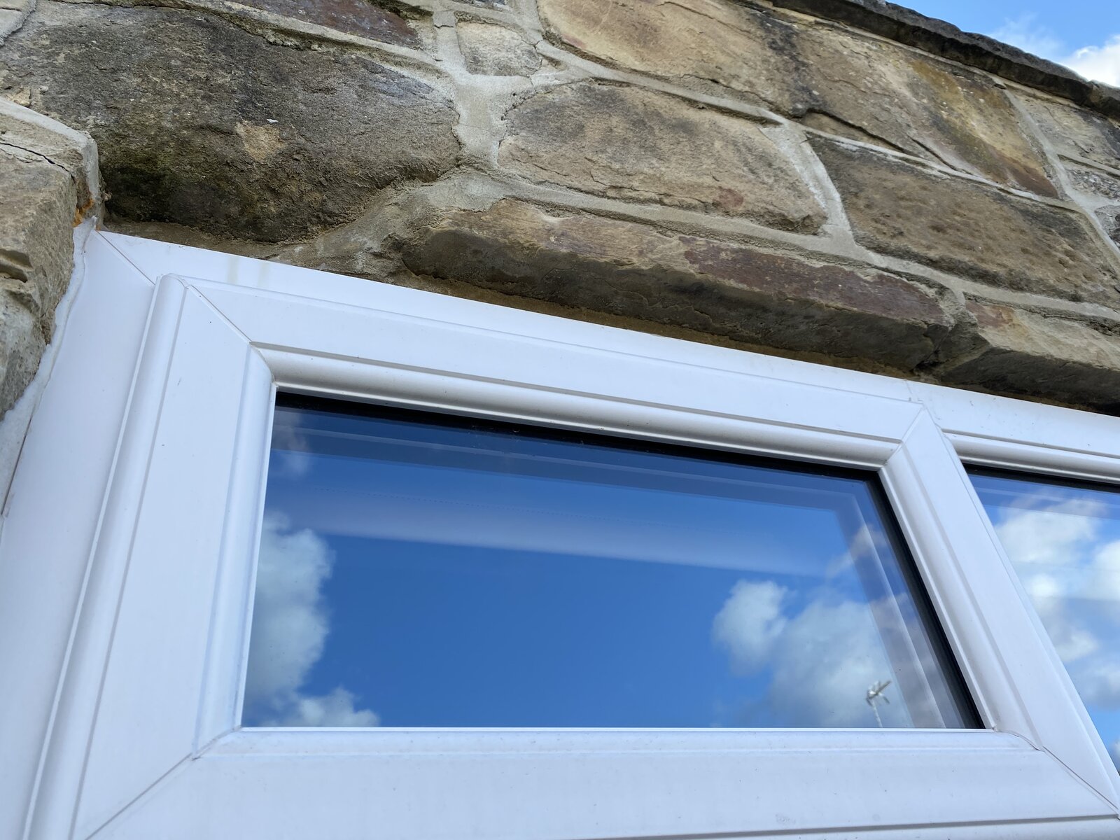 I was thinking a flat piece of trim stuck to the top of the window and pushed up against the bottom of the overlapping stone above and then sealed with silicone but would appreciate any suggestions.