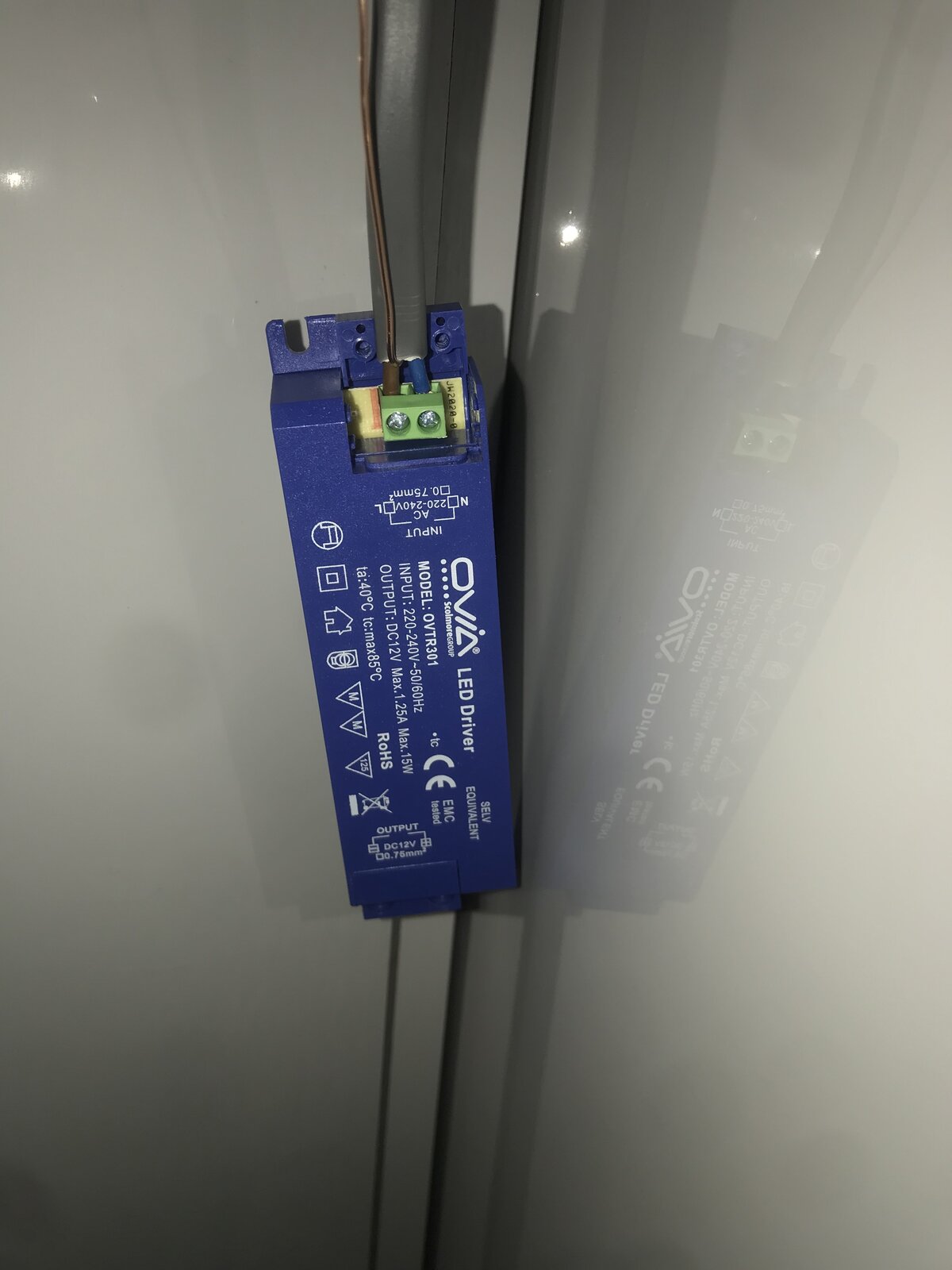 I’ve got a twin and earth mains cable providing input into an LED driver. The driver sits on top of a kitchen unit and I then have a 3 core flex that goes behind and down the kitchen unit into a JB that is screwed to the bottom of the unit. The 3M LED tape is connected and powered from this JB.