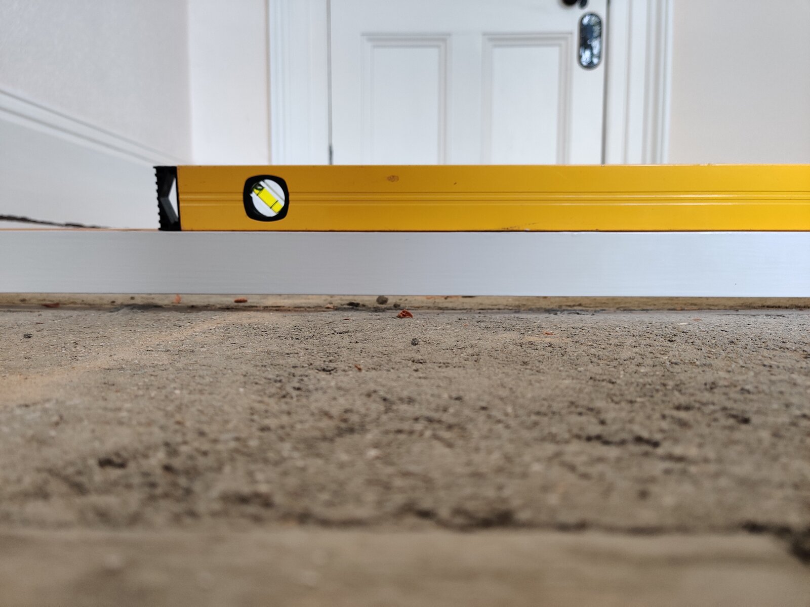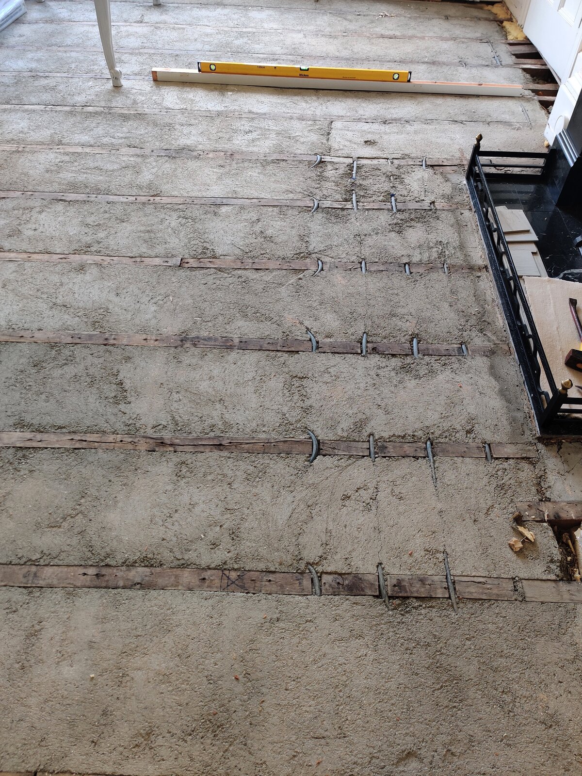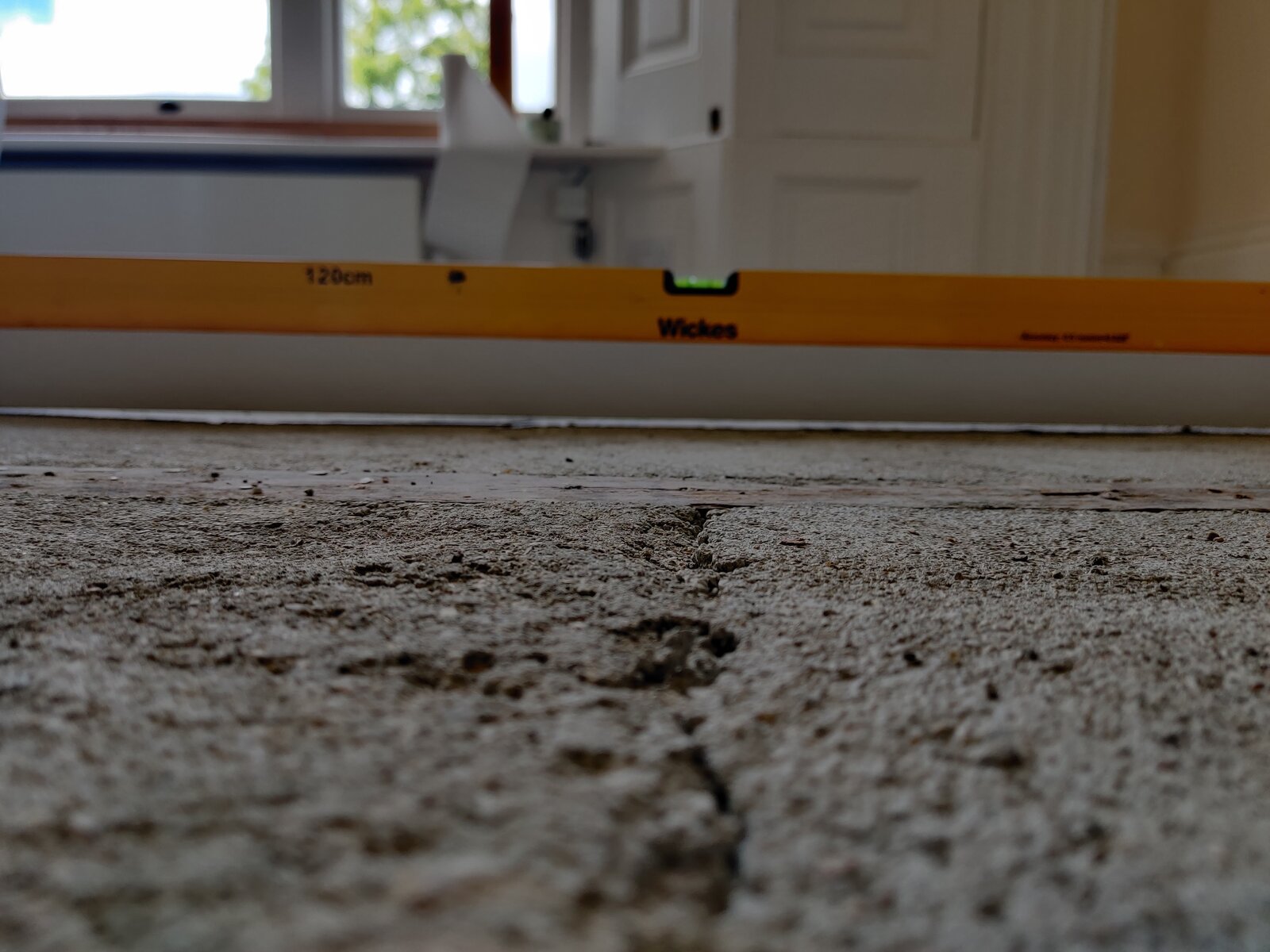 There is an area of c12m2 which has a dip/slope to the wall, focused in the area where the pipes run. Dips are between 2mm and 18mm deep. Some other minor patching required to level up to joists in other areas. Photos below.