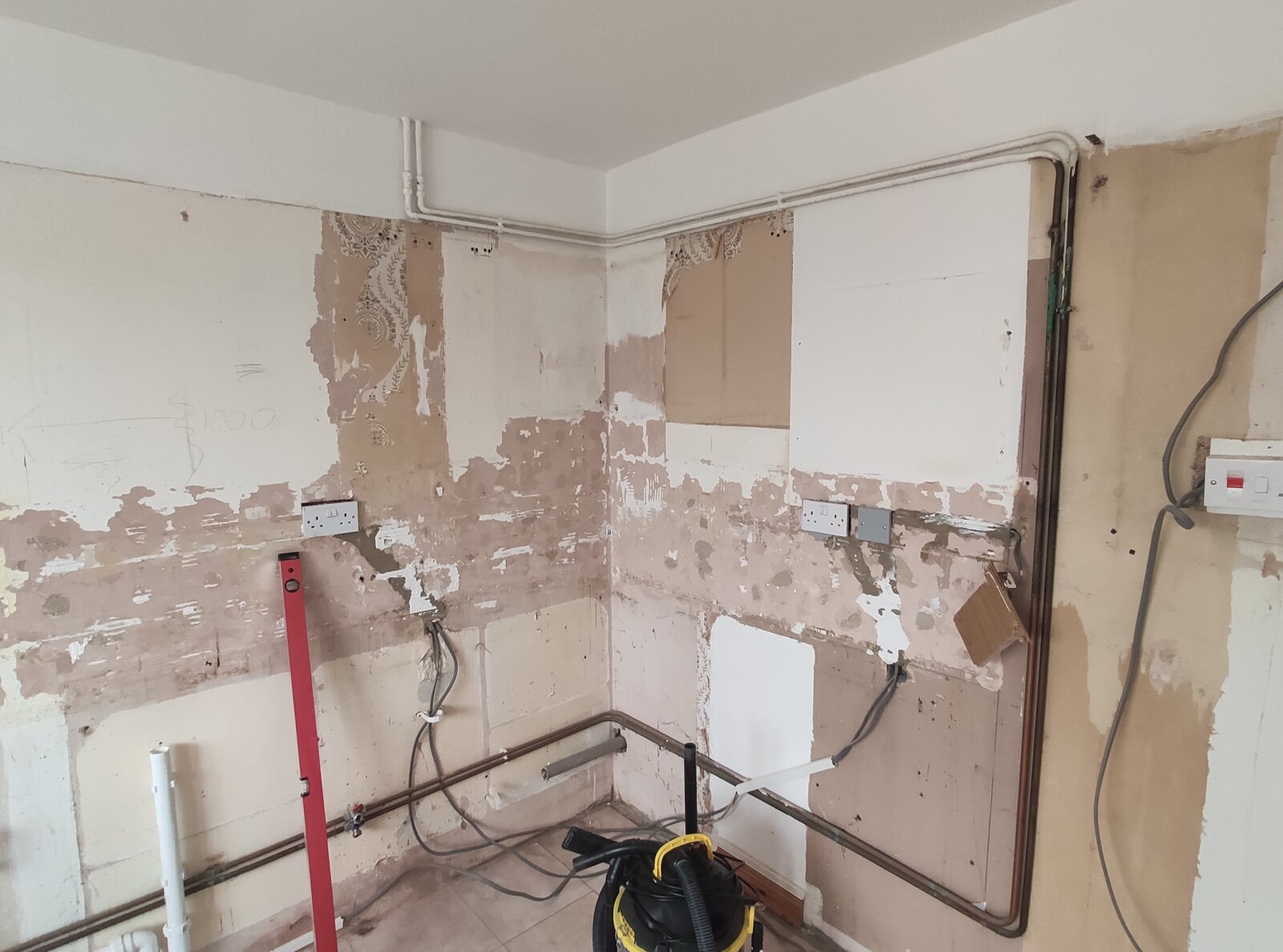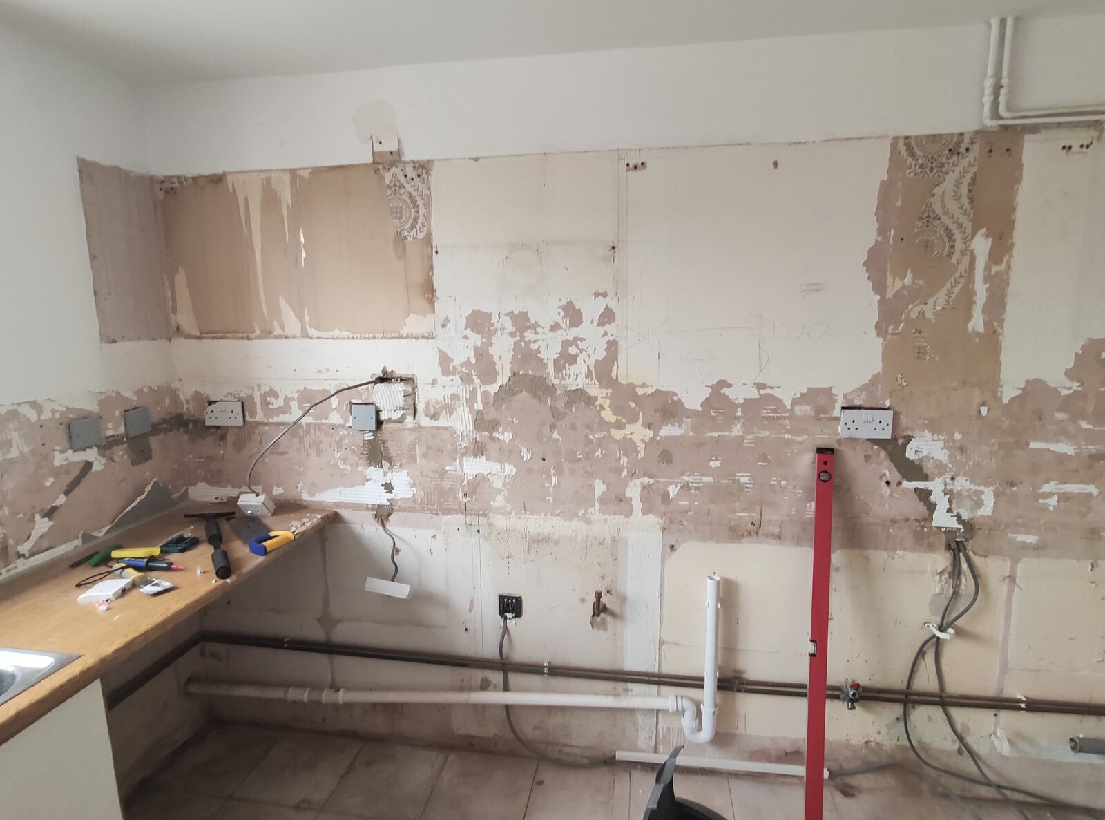 1) in the area that will be tiled, chisel away the unsound plaster exposing the sort of mortar underneat. Leave everything as is where I will not be tiling... the kitchen units will cover that area anyway