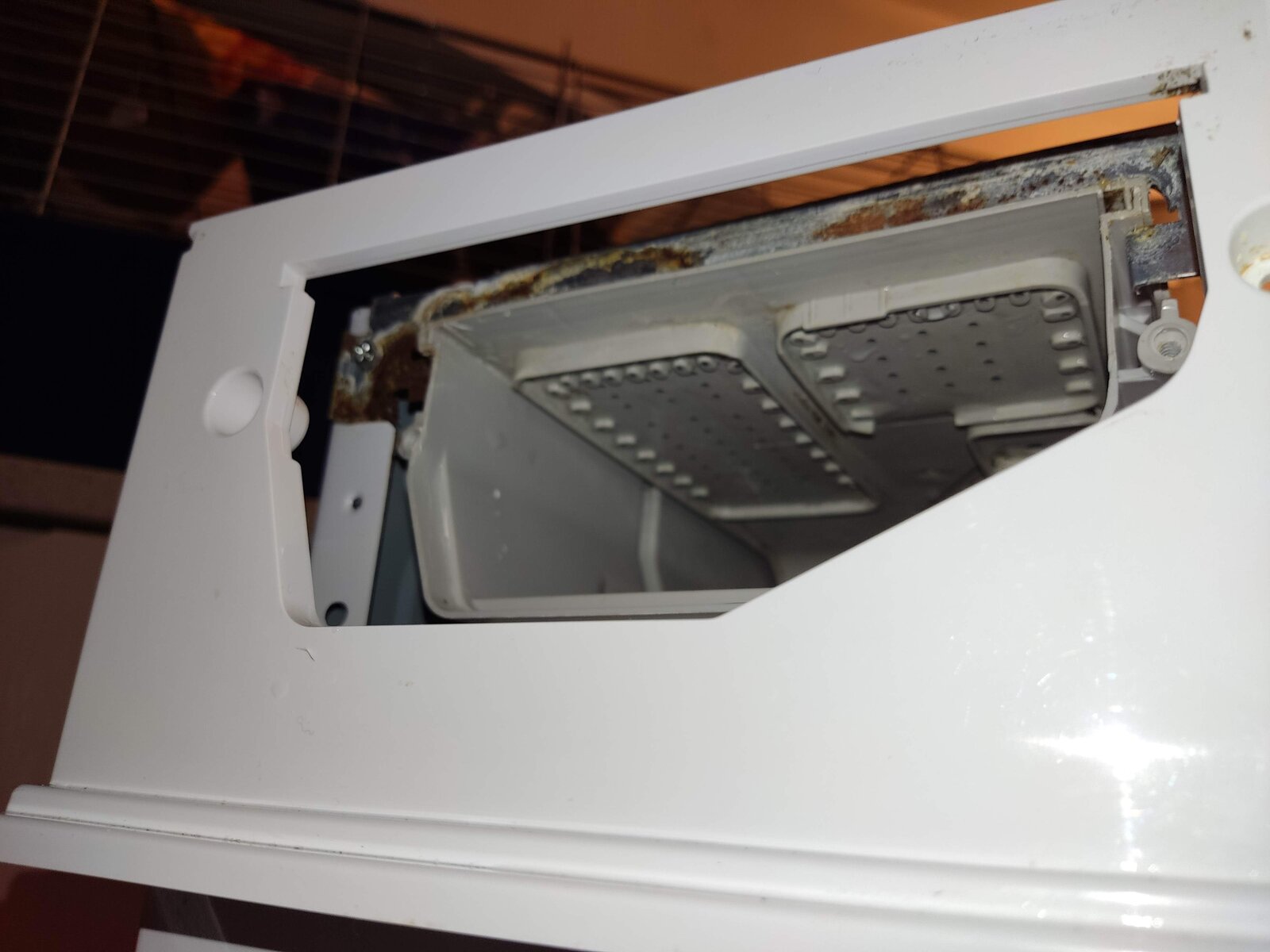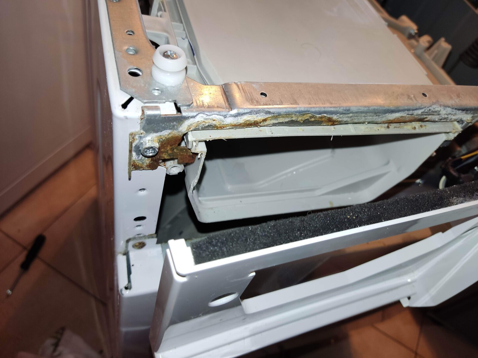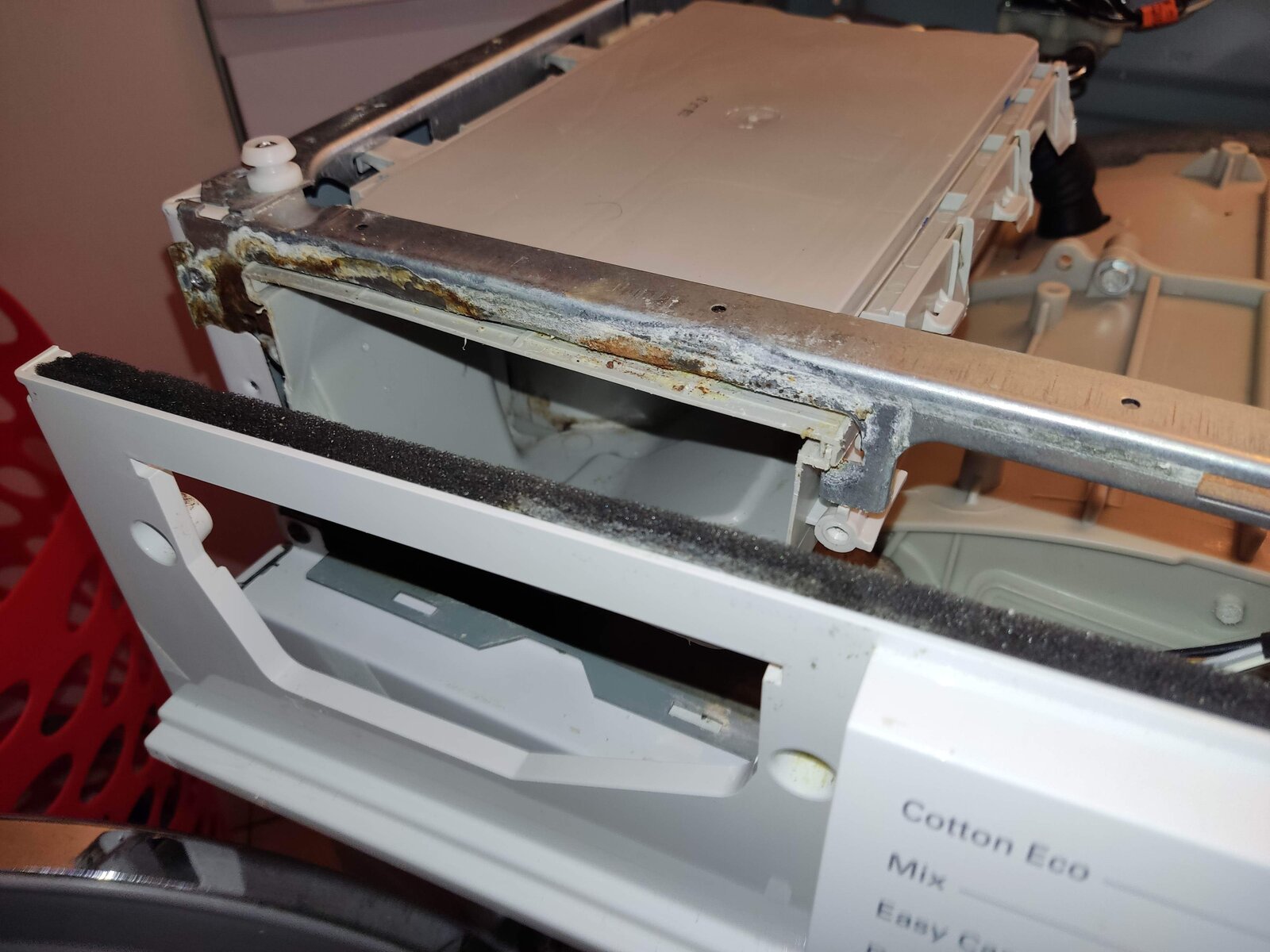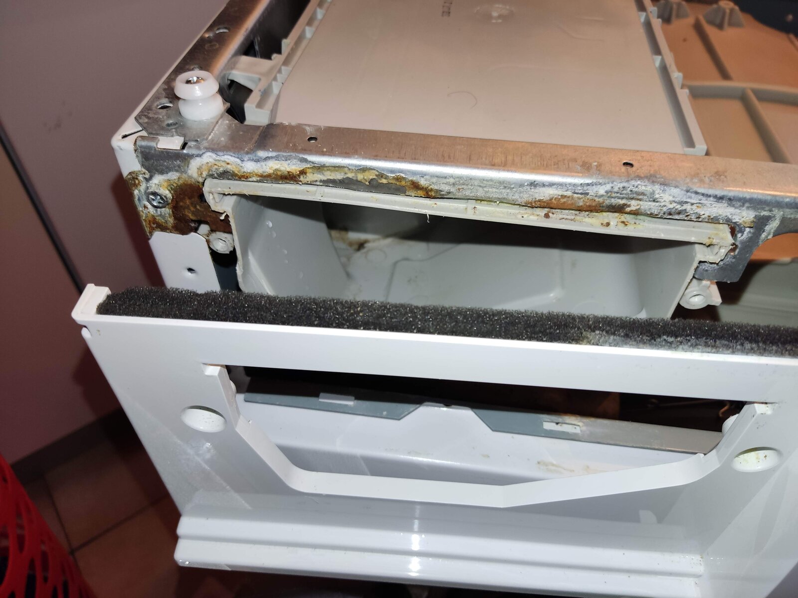 As per the photos, water is somehow coming out at the top of my detergent/soap drawer. It then runs down the inside of the machine to emerge at the front left foot (as you look at the washer).