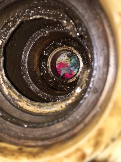 OK, here's some pics. I've had WD40 soaking in for a few hours but still no joy. The first one shows just after removing the seal, (before I got the hammer out)