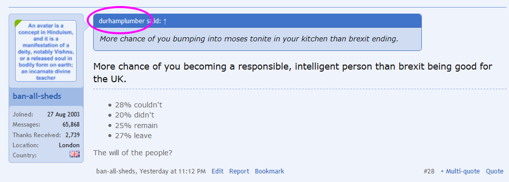 Nowhere in your post, which has been copied word for word, did you mention me. If you want to have a dig at anyone, please have the nous to indicate who you are speaking to, it's quite easy.I have seen some spectacularly stupid posts here in the last 15 years, but for you to write that just one post away from the one you quoted, deliberately omitting the part showing to whom I was replying, is definitely in the top 10.