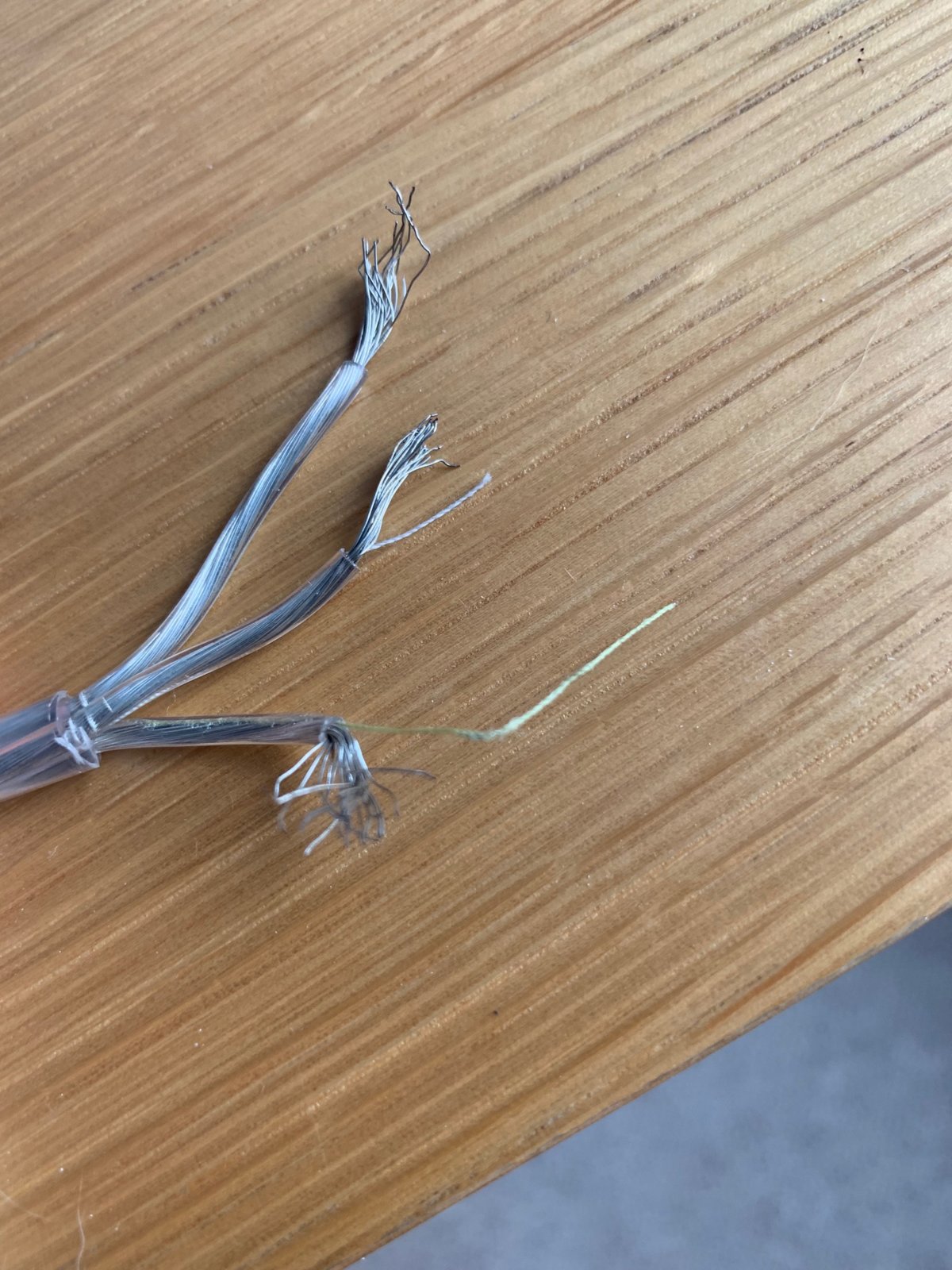 Hello. I have a pendant light fitting with a clear cable between ceiling rose and light, a rat chewed through the cable in the loft space (since moved!) meaning I lost which cable goes where in the connector block. Upon stripping the wires I've found that all three have clear sleeves and no colour co-ordination other than one wire has a very thin white string, one has a very thing green string (presume earth) and one has nothing. If the white one was blue I would imagine it is live, but I haven't come across a white one like this before and don't want to mix-up live and neutral! Has anyone come across this before? The pendant is a 2350CP model from Firstlight Productions Ltd. Have asked them but no response. Thanks.