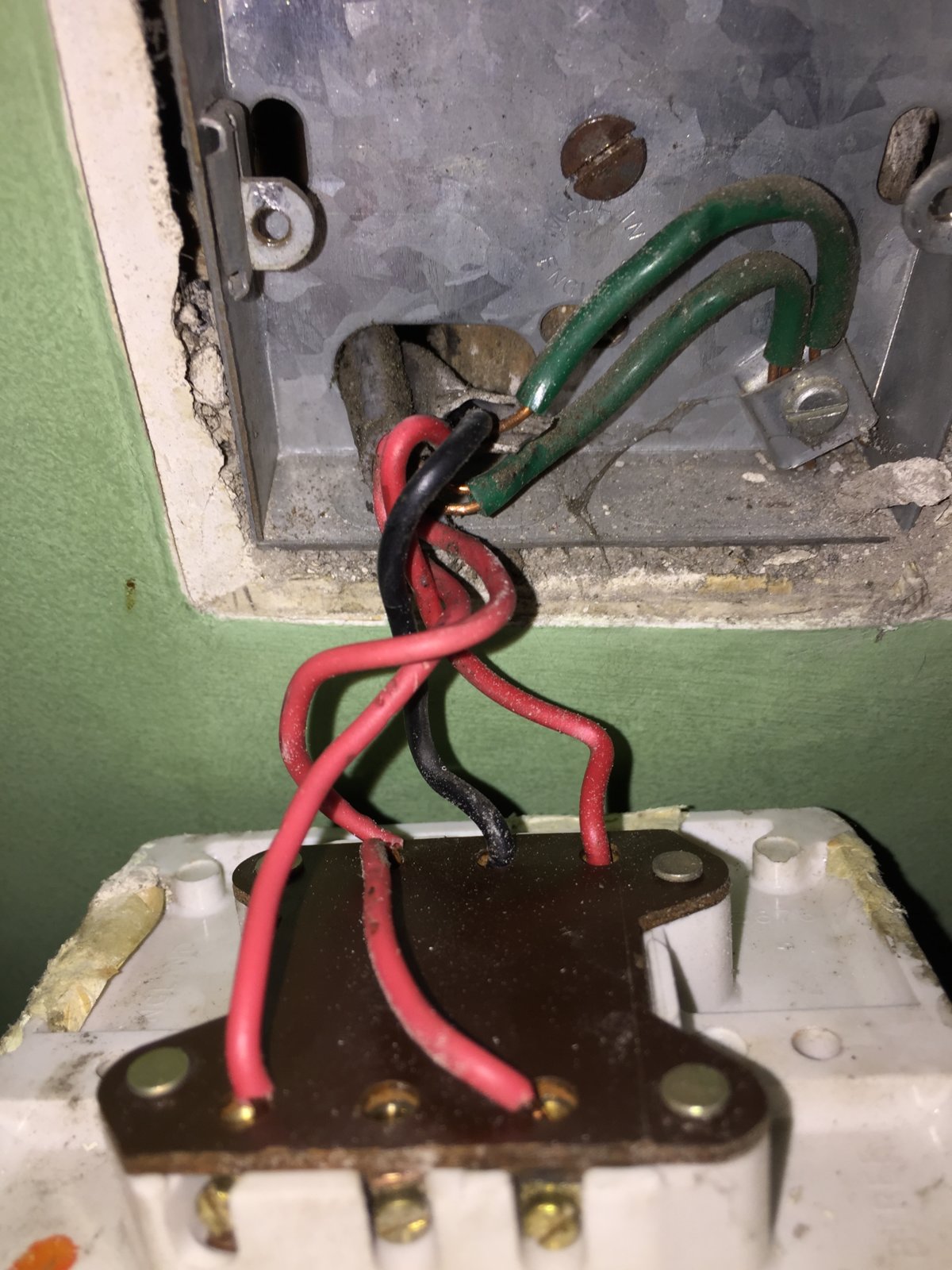 Hello all. When trying to get to the bottom of why the 2 ceiling lights are not working, we detached the light switch and expected to see 2 live wires, instead we saw 3. The wiring seems crazy and does not make logical sense. One of us has a good degree of knowledge of electrics but know our limitations (i.e. when to the job over to a qualified electrician) but we have not seen this before. It’s an old Victorian house (re-wired completely in the early 80’s). At present the room has two pendant ceiling lights, a pull switch hanging from the ceiling and a double light switch on the wall. Could anyone advise what we could be seeing here?