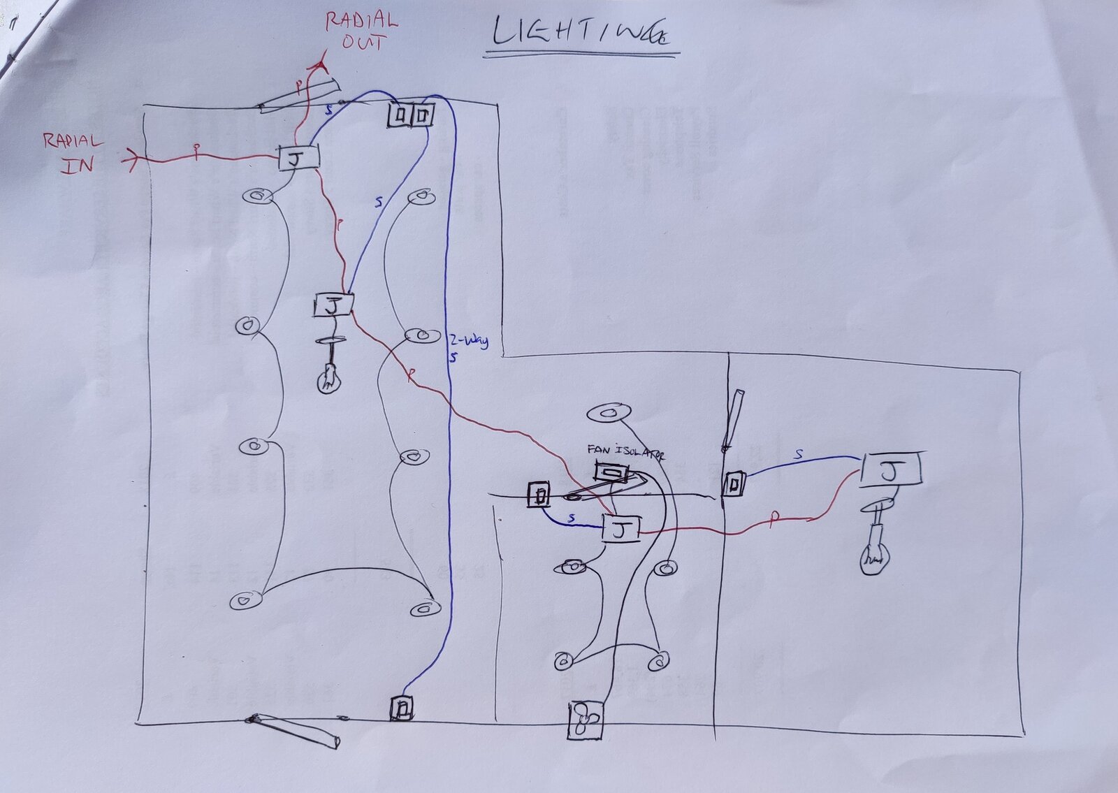 At the moment, I'm planning on running a spur from the existing kitchen pendant (closest power feed) to power 8 LED downlights in the kitchen, 4 LED downlights in the bathroom, 1 extractor fan, and 1 pendant light in the bedroom. Outline is attached, what are your thoughts? Thanks.