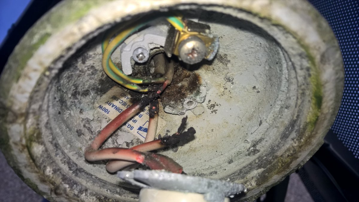 After unscrewing the glass I could smell that I had found the problem, I tried to take pictures of it as I disconnected it however various wires just disintegrated. I have removed the light fitting and isolated all the wires in an enclosure. However, I'm not sure what connections I have got and how they would go back into a new fitting. The light also has a separate PIR sensor.