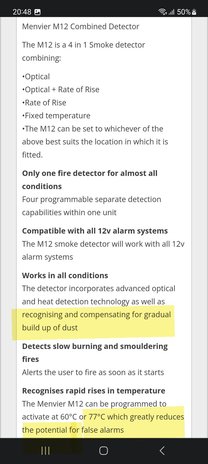I would like to source a smoke and/or heat sensor that can be wired into my Galaxy Flex panel, that has a high temp trigger level and high resistance to dust, so it does not trigger false alarms in summer or due to loft dust.