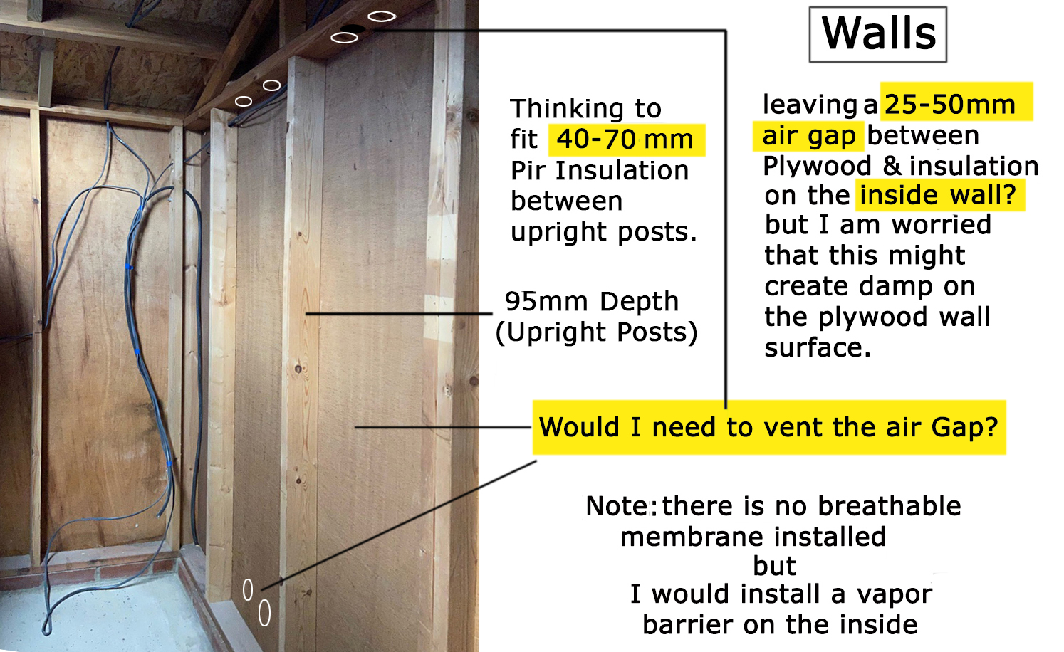 My question - How do I do this and do the walls also need venting to allow a through flow of air? Note: There is No breathable membrane installed on the outside walls, I do intend to install a vapour barrier on the inside.