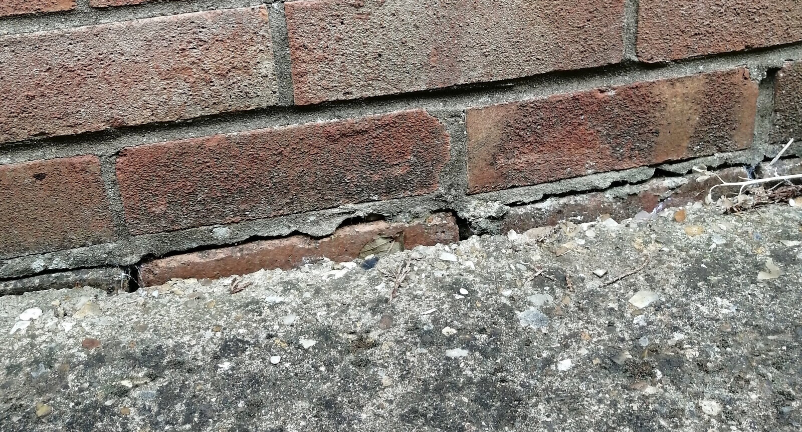 60s Det Bungalow with concrete pathway. The path has started to crack and sink, could it have taken the lower course of brickwork with it? If so, what has become of the foundations? Its happening to approx. 2 - 3 metres of one wall to the rear corner.