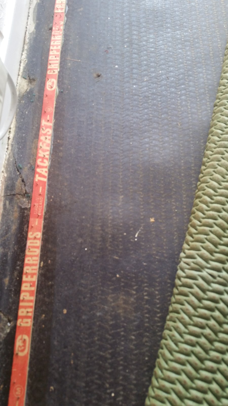 Are you sure it's not just had some gripper rods screwed down and then pulled out leaving a hole and some damage?