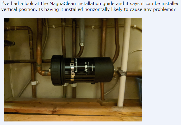 I've had a look at the MagnaClean installation guide and it says it can be installed on horizontal pipework, but all the diagrams show the device itself being in a vertical position. Is having it installed horizontally likely to cause any problems?