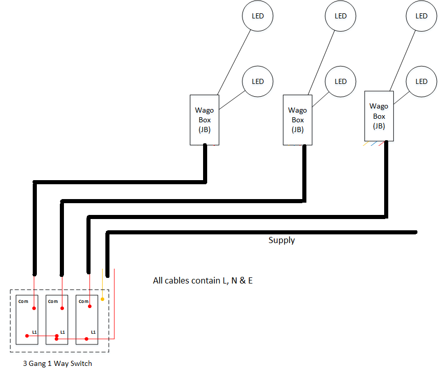 The downlights will be controlled by a three gang switch, of which will have its Wago JB, where the live feed will be connected, only.