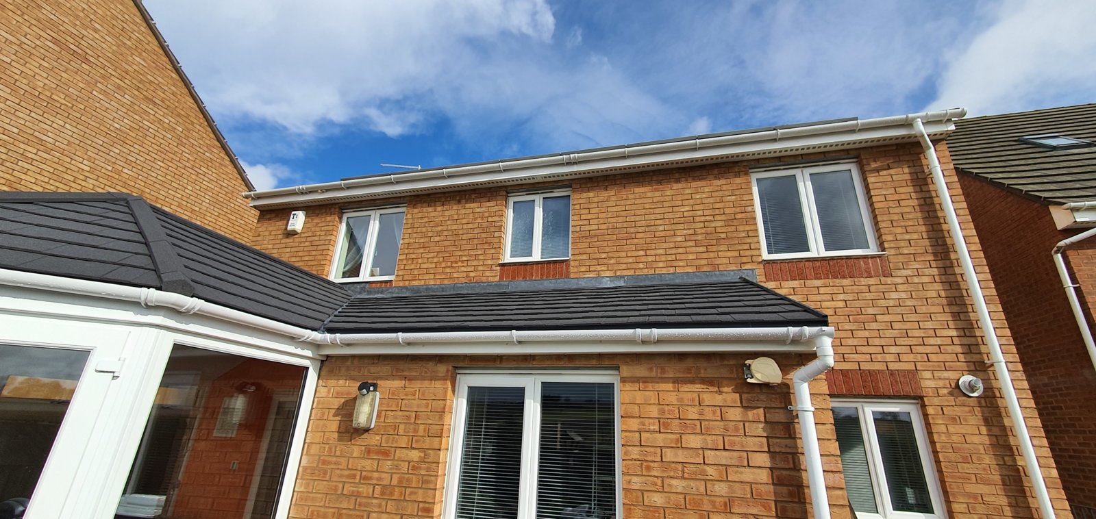 The kitchen extends out of the back of the house and has a separate roof of it's own and this is how the house was built. The previous owners (who had it from new) added a conservatory to the side of kitchen pretty much as soon as it was built.