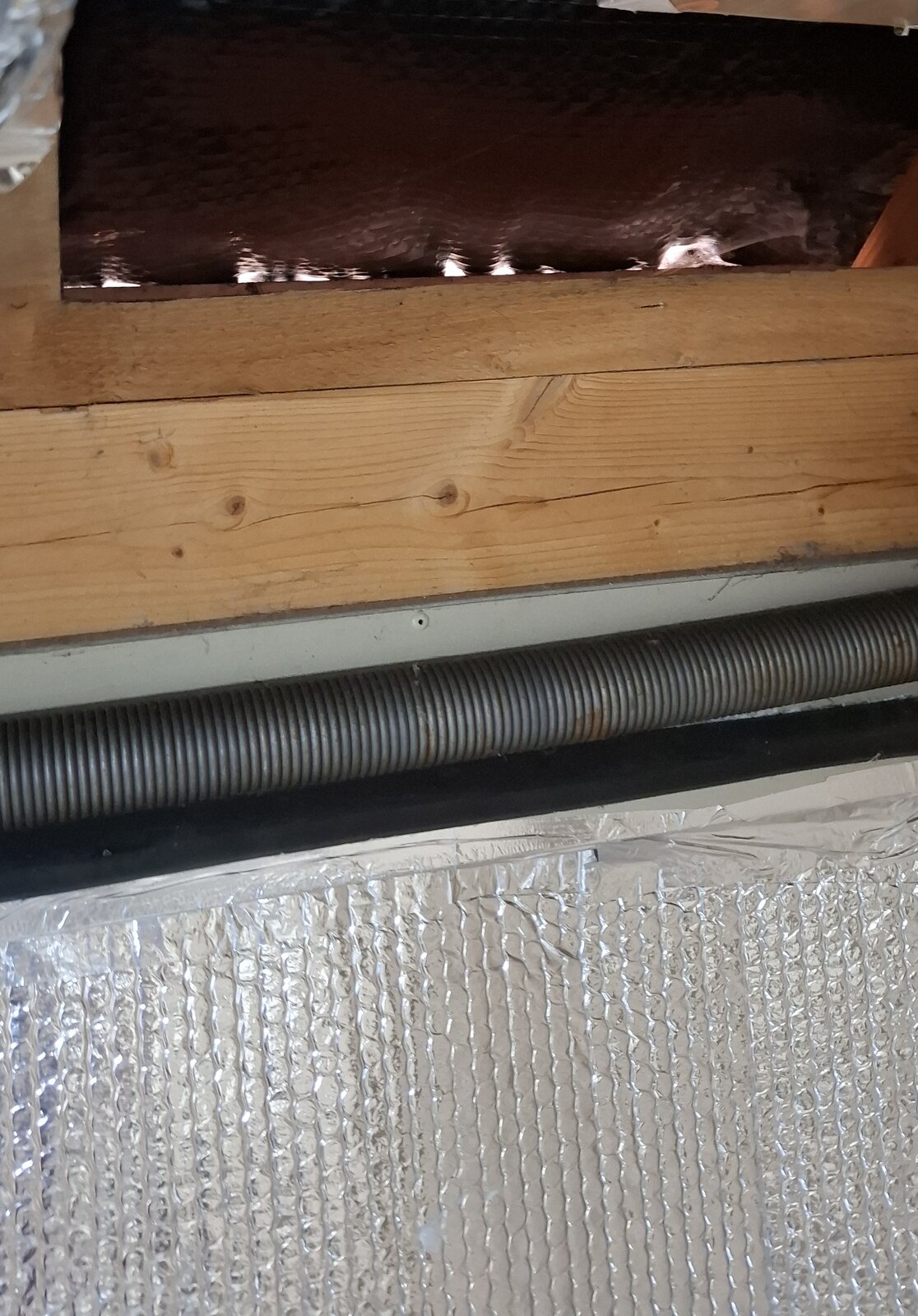 How to make this airtight? I want to stop air entering garage through the bottom of the plastic sheet under roof tiles in my garage as I want to convert it into a home gym. There are soffets in the fascia overhand that ventilate in the roof space. I am also going to put insulated wrap as a makeshift ceiling under this