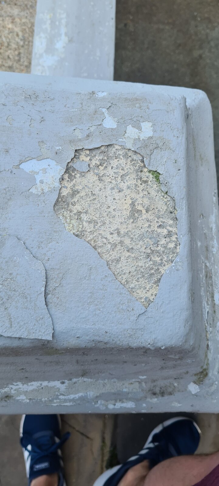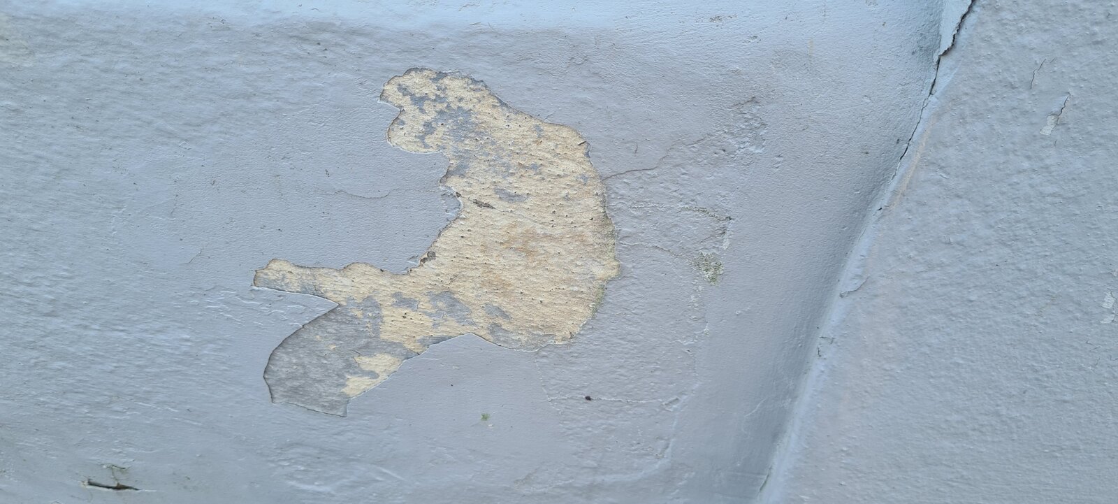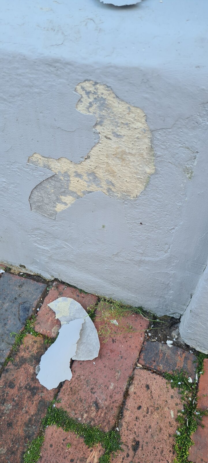 In the process to freshen up our building and some part, the paint has flaked as per picture. (had a gentle jet wash on the wall and hand brush with fairy liquid to remove the greenery / black on the wall - hence breaking what was close to be broken I guess)