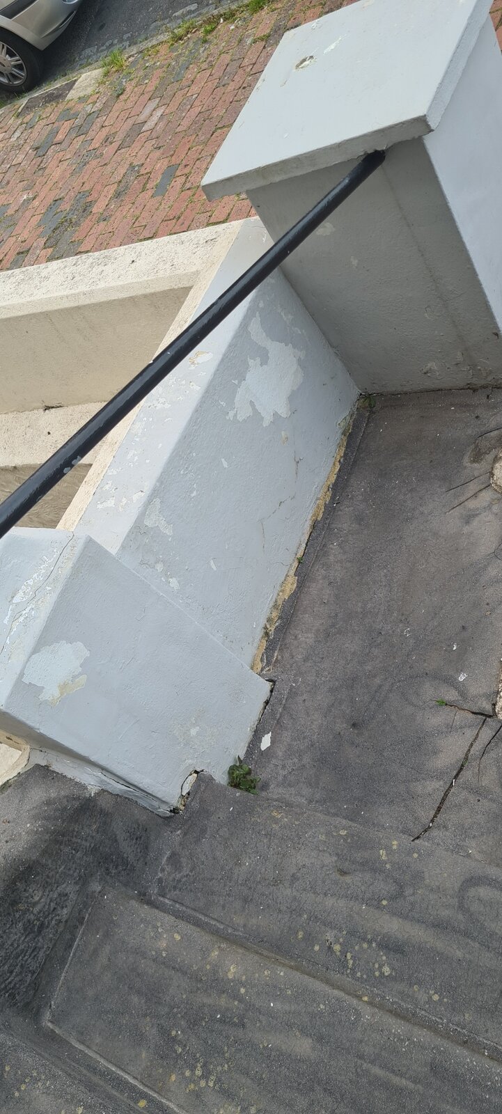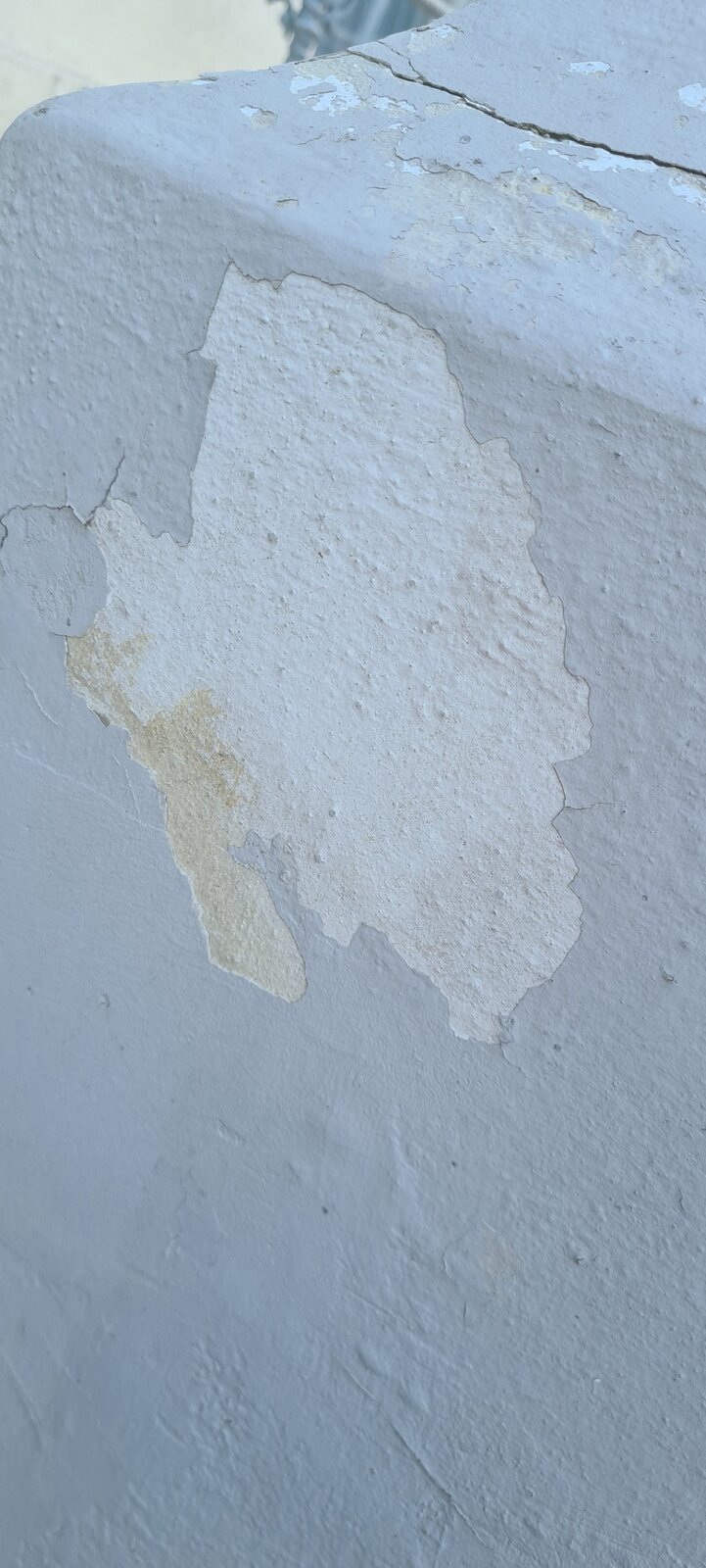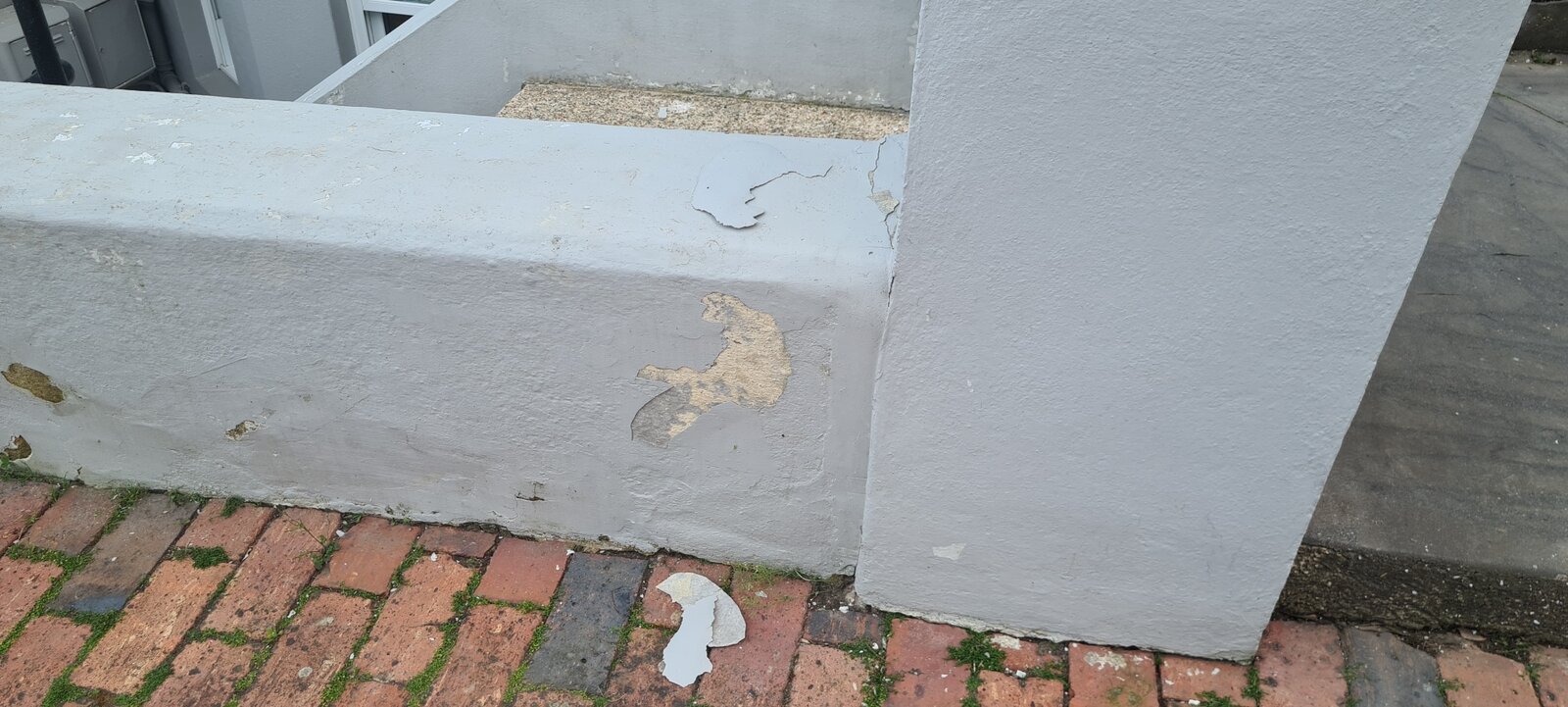 In the process to freshen up our building and some part, the paint has flaked as per picture. (had a gentle jet wash on the wall and hand brush with fairy liquid to remove the greenery / black on the wall - hence breaking what was close to be broken I guess)