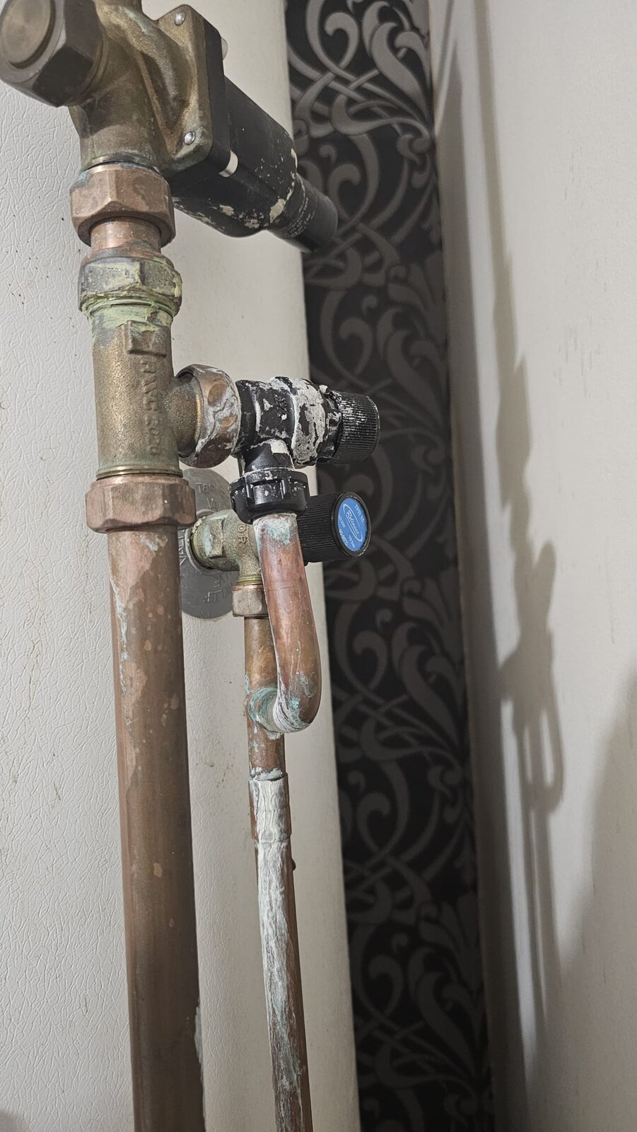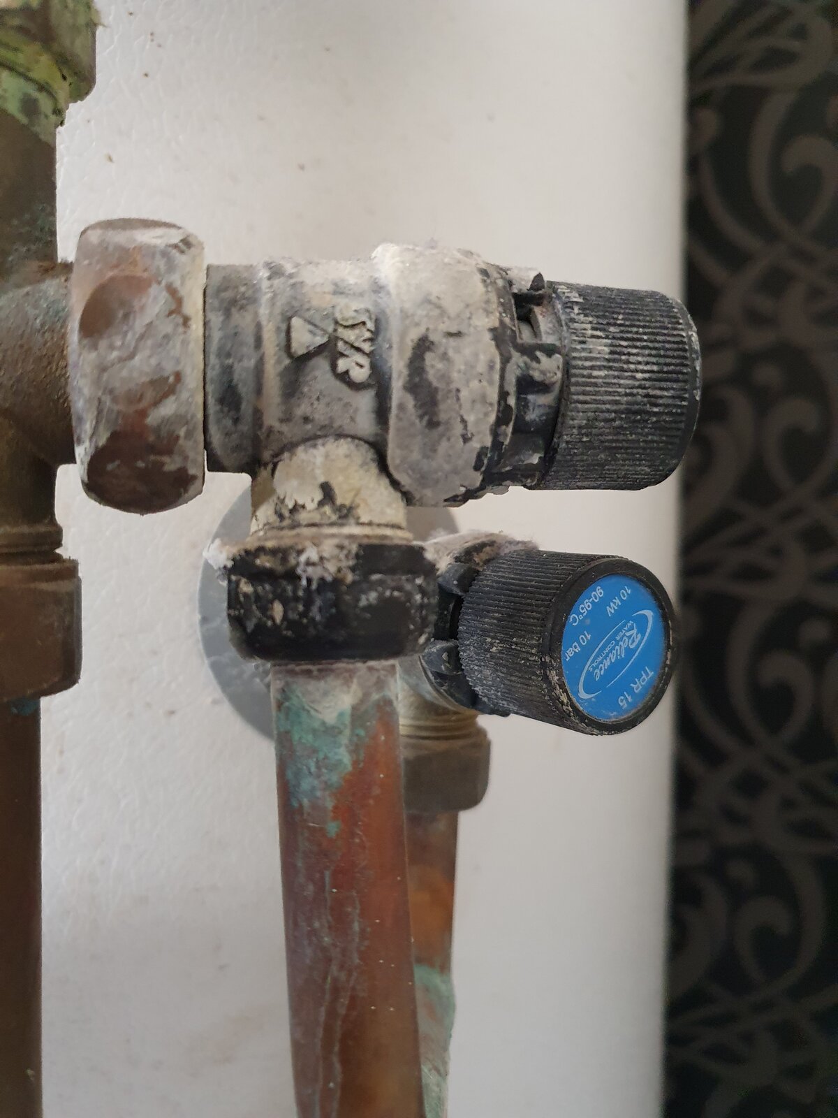 Background info: Got the property 3 years ago, the Megaflo HE worked well. There is a huge amount of lime deposits on the Expansion Relief Valve (foreground) and a bit on the TPR Valve (background). There should have been a lot of leakage but we don't know what exactly happened.