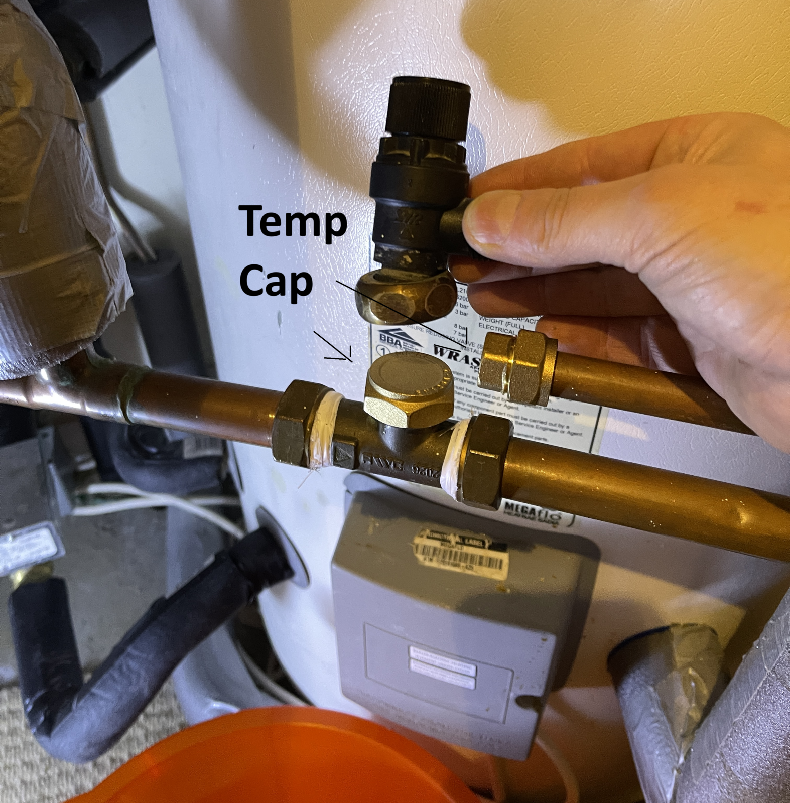 Until i can get another replacement 22mm tee and pressure relief valve part i hae capped off the tee for the pressure relief valve using a 22mm blank.