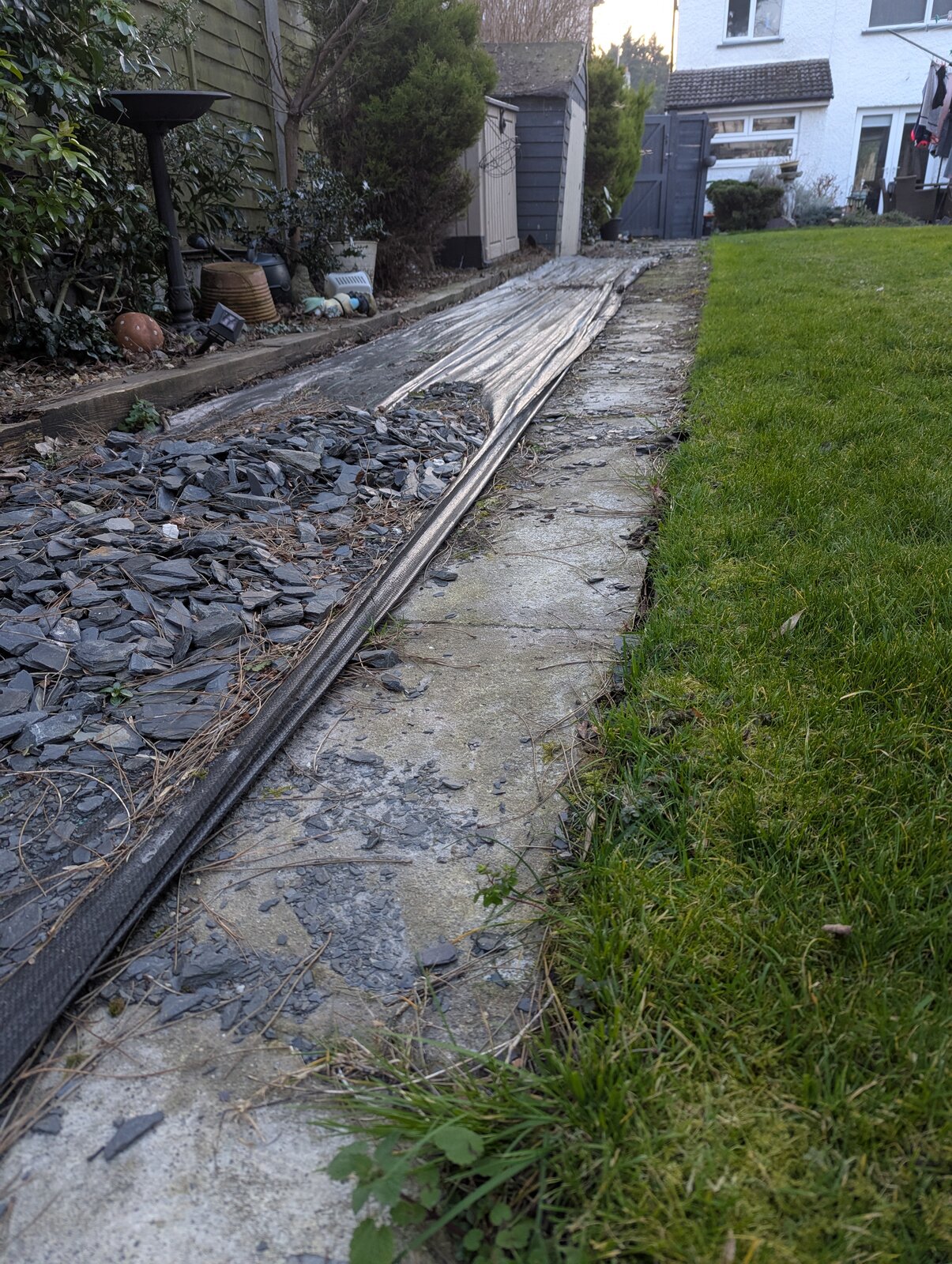I've taken up the slabs and most of the slate (as seen from the photos) and there's a concrete base underneath. From a cleanup point of view, I was just going to turf it all and then clean up by mowing/spraying and raking through winter/spring. But I guess that whole concrete base would have to come up then. Does anyone have any better ideas of what to put down there? I guess I could repave it with smoother slabs that would jetwash easier but it's a bit of a hassle dragging the hose and pressure washer every week or two.