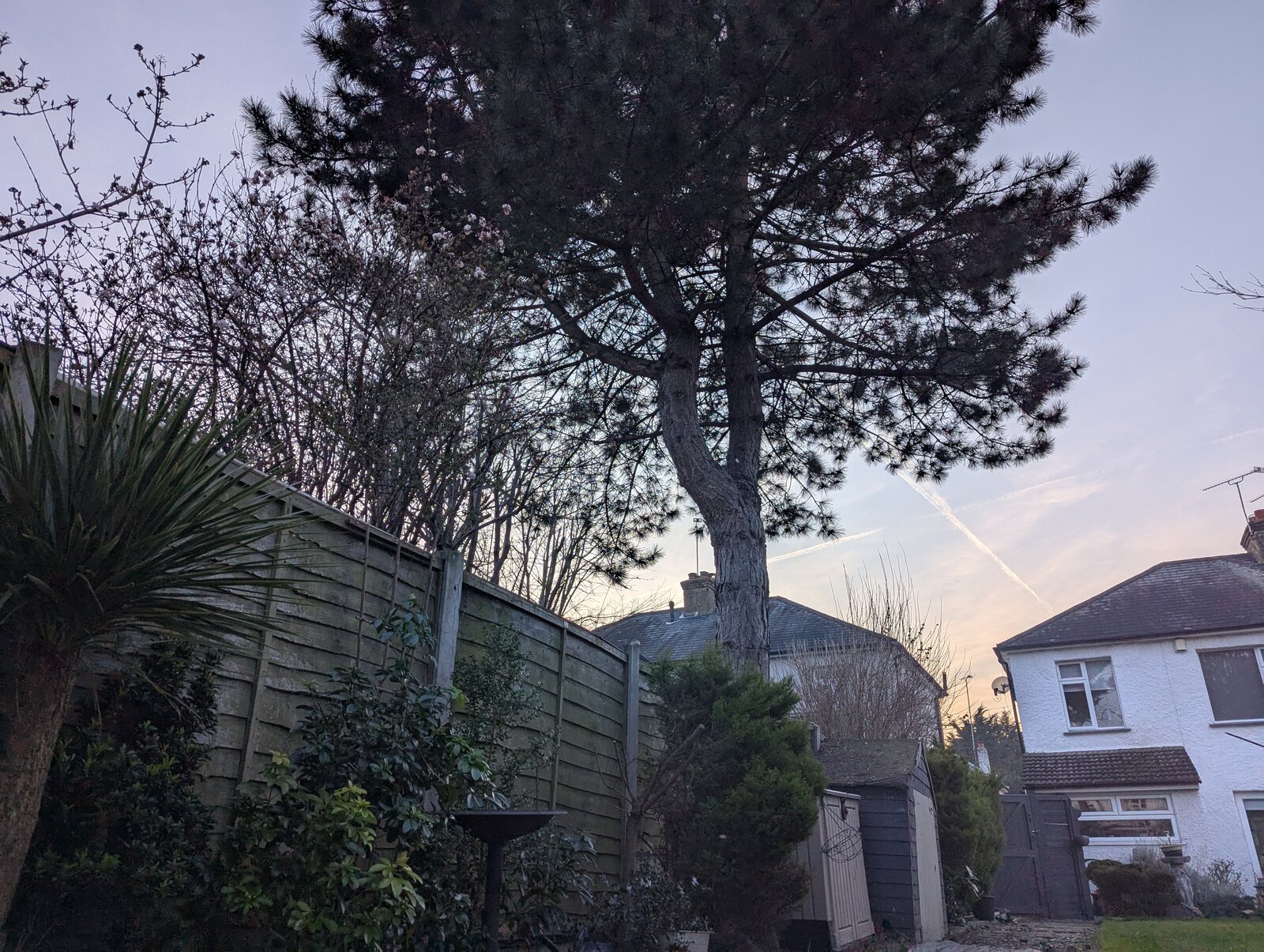 My neighbour has a pine tree that overhangs our garden. Aside from the constant pine-needle drop which fills two or three wheelie bins a year, which I can live with as all I need to do is rake it up every so often, we have pigeons roosting in the higher branches and most of the winter they just cr@p incessantly into my garden.