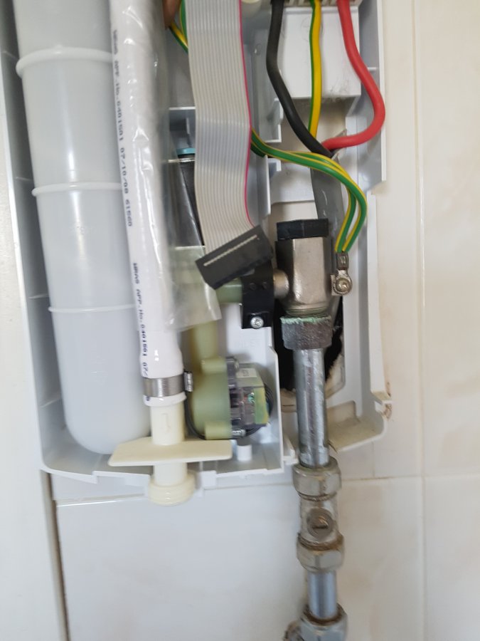 1) Turn water supply off by using a flat bladed screwdriver to turn the isolation valve so that the slot is horizontal - the iso valve is outside the shower unit, bottom right in your photo.