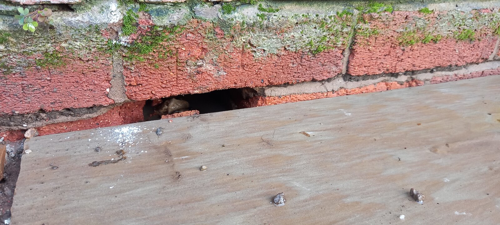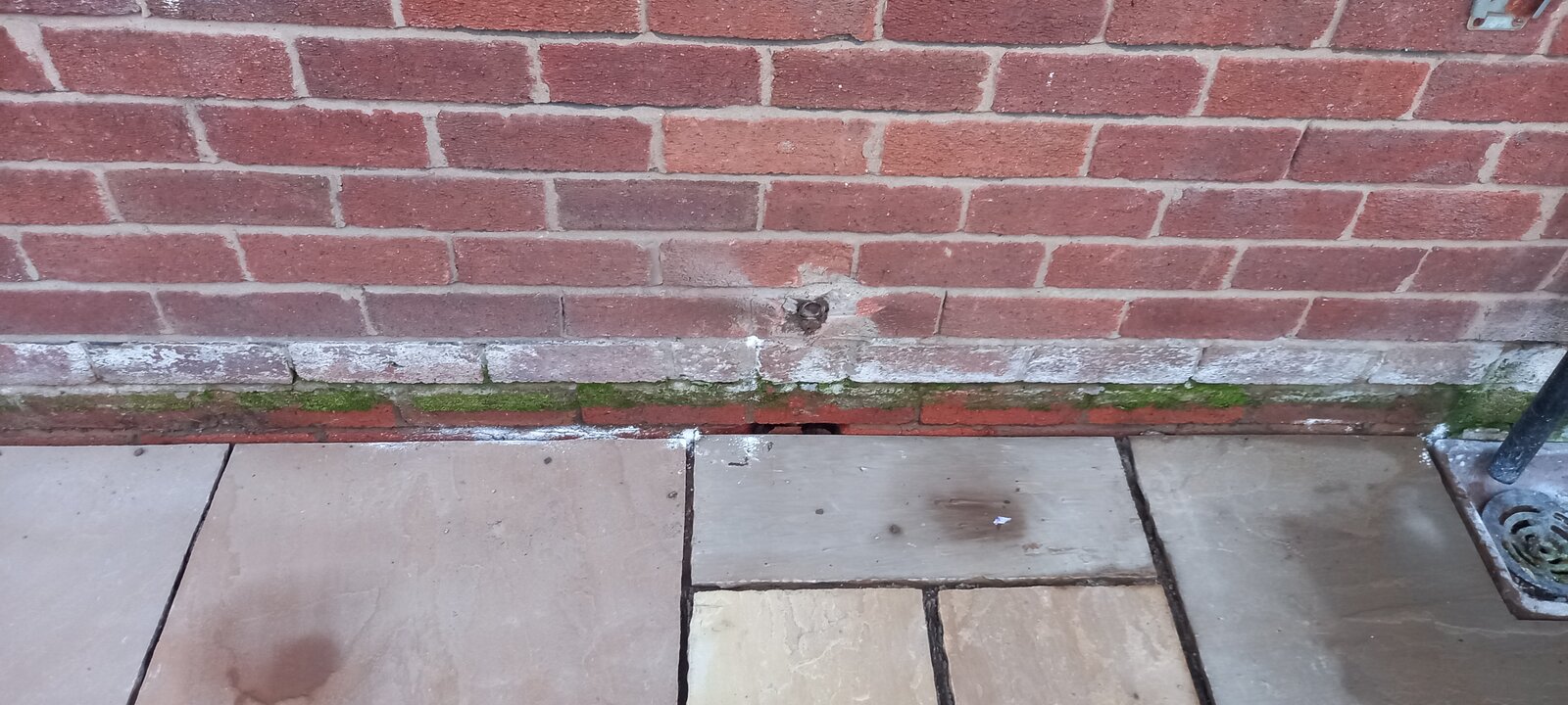 Not so much a missing brick but one that appears to have been broken in the past and hidden behind an old, now removed, gas pipe, and was full of mud so not noticed until today. I found it when I was blasting dirt off the bricks with a jet wash. Indian sandstone laid along that wall the other day now well set in place. The brick is a couple below DPC. You can see the inner brick skin through the hole but the cavity at that point seems to be full of concrete stuff.