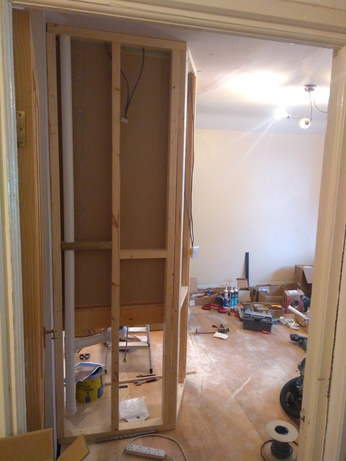 Question is regarding that red wall, would it be reasonable to put a double 63mm stud at the door end as normal, but then take a single plasterboard sheet (or maybe a double board) the full 500mm to the first stud of the wall behind the basin? Thus gaining a better sight line into the room without losing the same off the basin width.