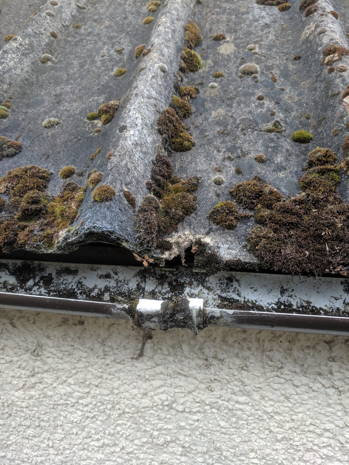 Moss growing on an Asbestos Cement roof will hold on to the roof by a small root system.