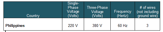 For my "day job" my employer builds & ships educational equipment to many countries, including the Philippines. Our standard config is 220V single phase & 220V L-L 3 phase for the Philippines.