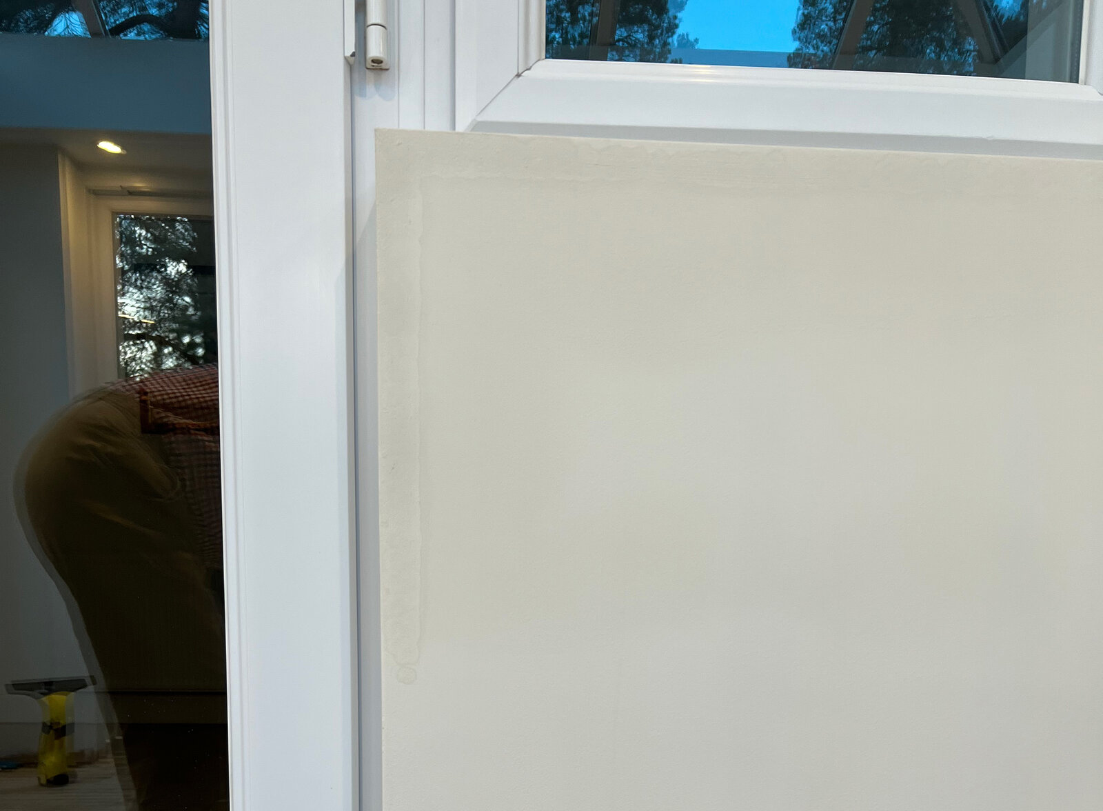 I have had some plasterboard and plastering done. The plaster has been painted with a mist coat and 3 top coats, generally 24 hrs between coats. However, I have a mottled effect where the beading is around edges/corners. I have even tried a Cover Stain product, but this didn't cover the effect.