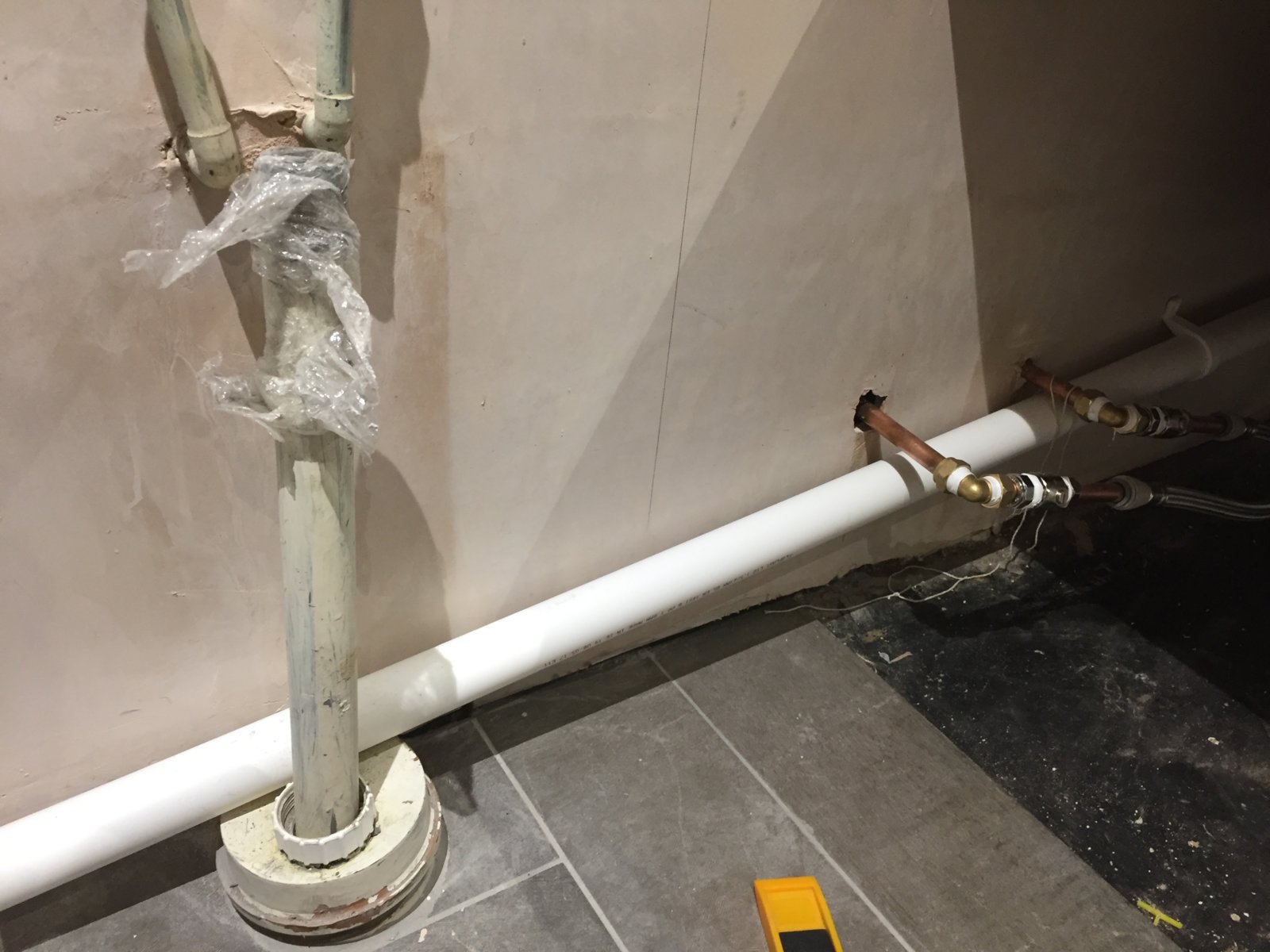 My intention was/is to T the bath waste and basin waste together and put an anti-vac trap on the basin. The length of the bath waste is 1.3m and the tee needs to be as low as possible to ensure adequate fall because the drain is so high above the floor.
