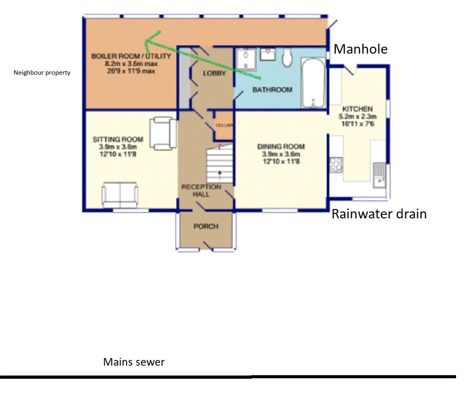 The drain is right next to the current bathroom, where there is a manhole. I assume it then goes under the kitchen extension to join the main sewer on the road in front of our house.