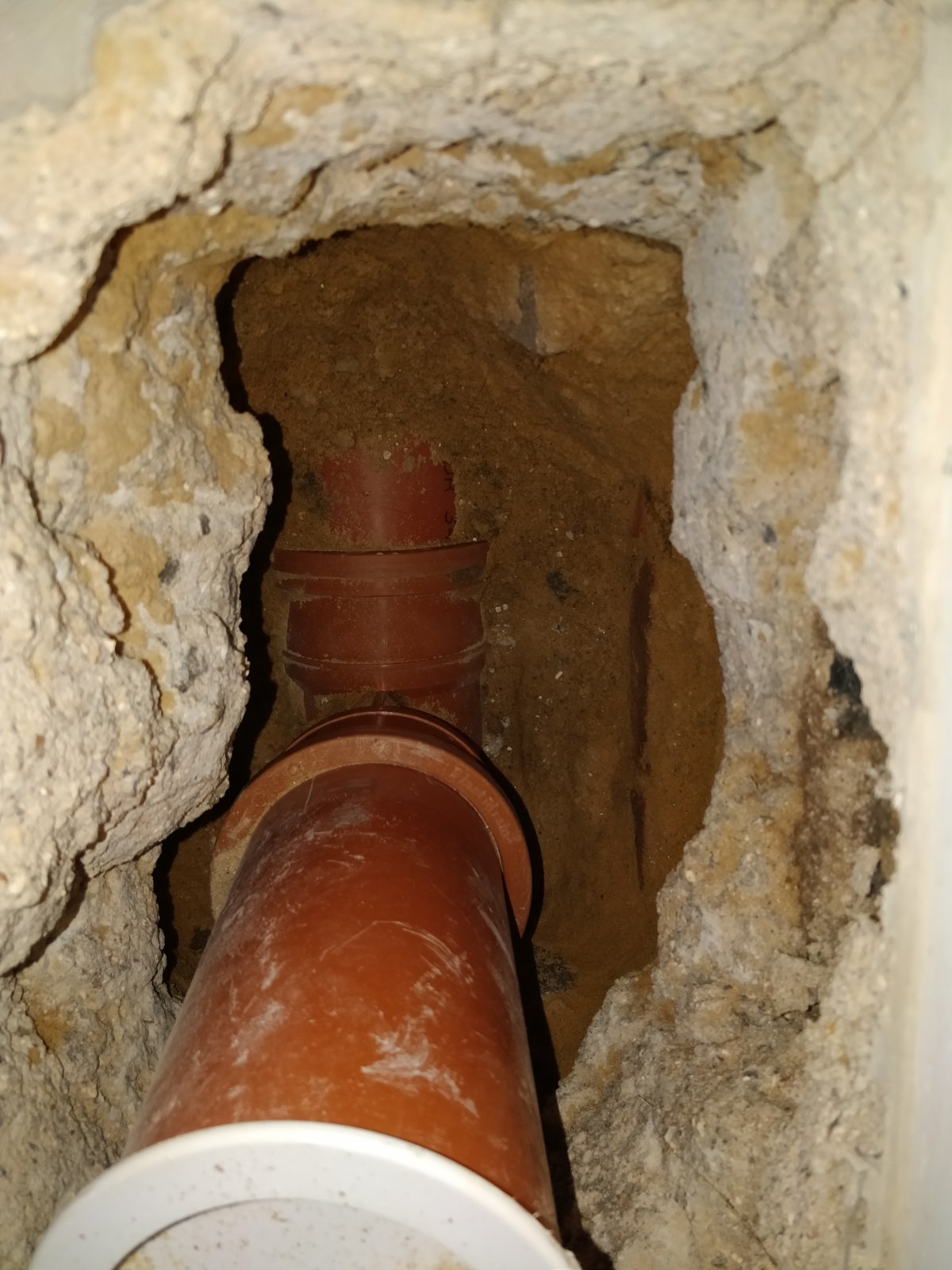 The current toilet if quite far from the wall and appears to go straight into a plastic soil pipe buried into a concrete sub floor, my guess is it drops fairy straight down into a T section that joins into the rest of the system, which has the main drains to one side and an AAV to the other.