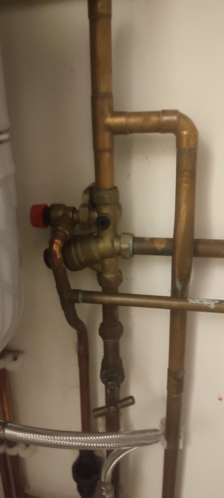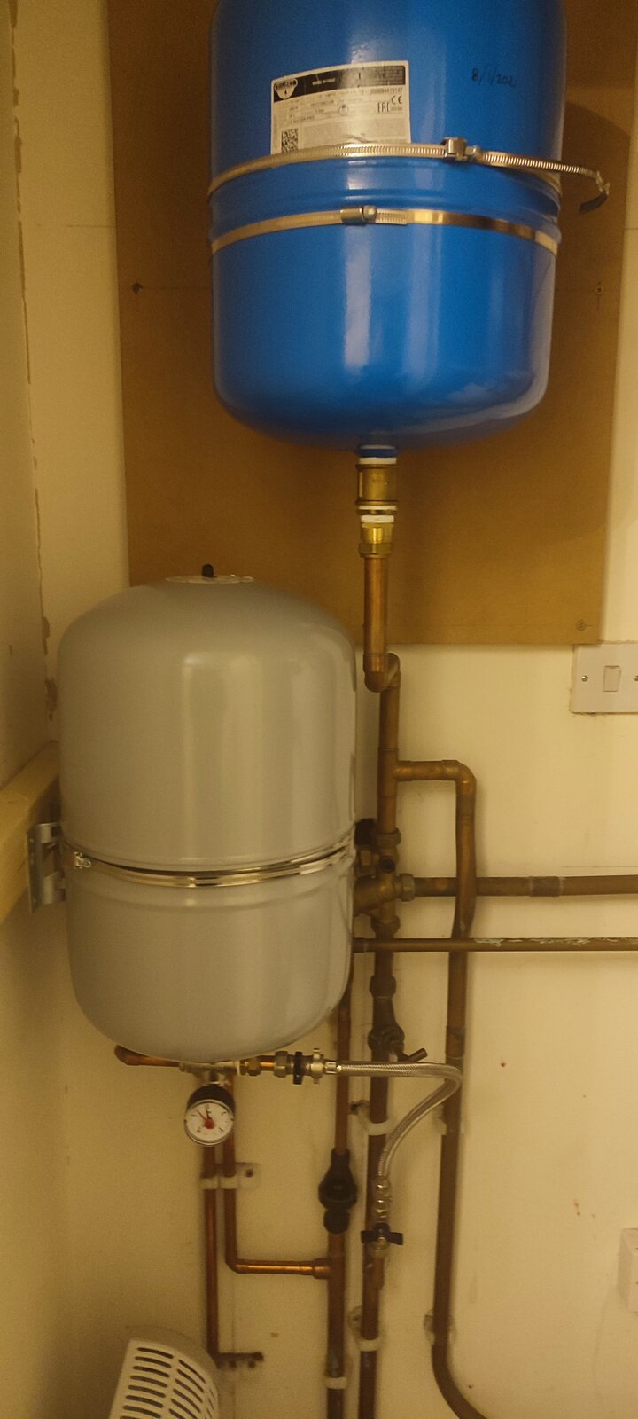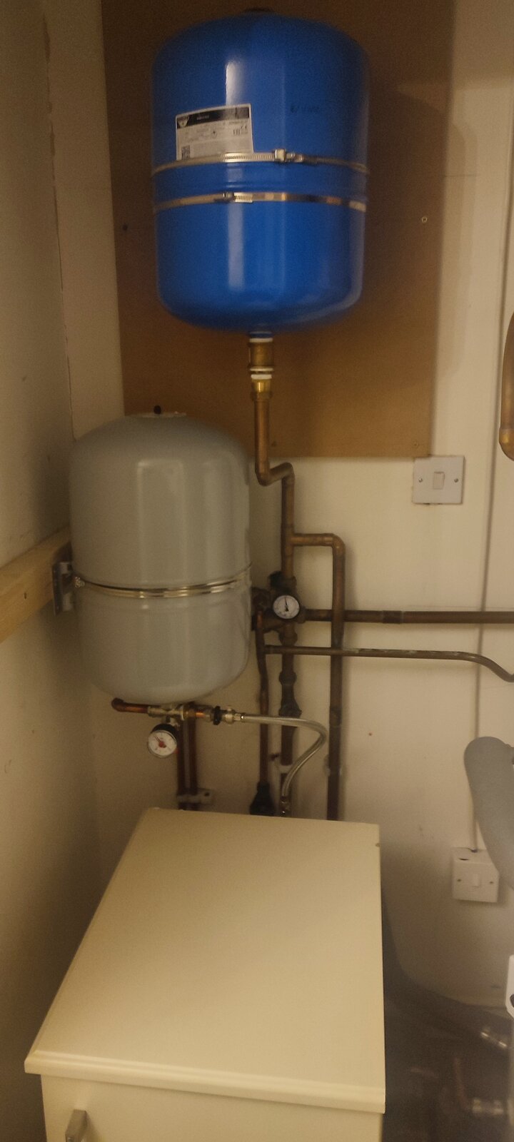 With a slight adjustment to the 22mm pipe going to the blue vessel we could move it to the right and there would be plenty of room for the heating expansion vessel to be moved up next to it ,basically by extending 2 pipes , there is an auto air vent attached too.