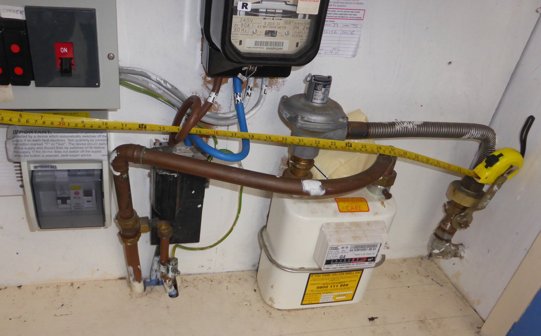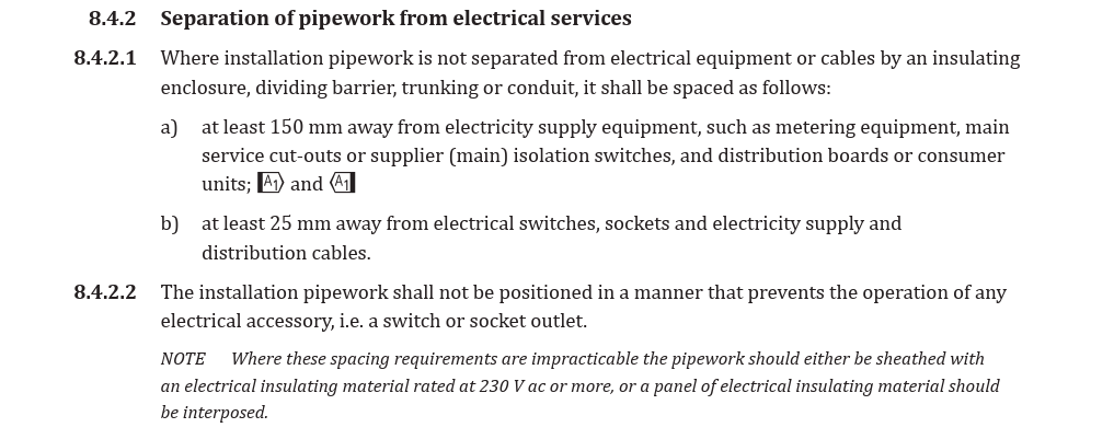 This is some info which AI dug up for me: Gas pipes and meters must be installed at least 150mm away from electrical consumer units, fuses, distribution boards, electrical switches, or sockets.