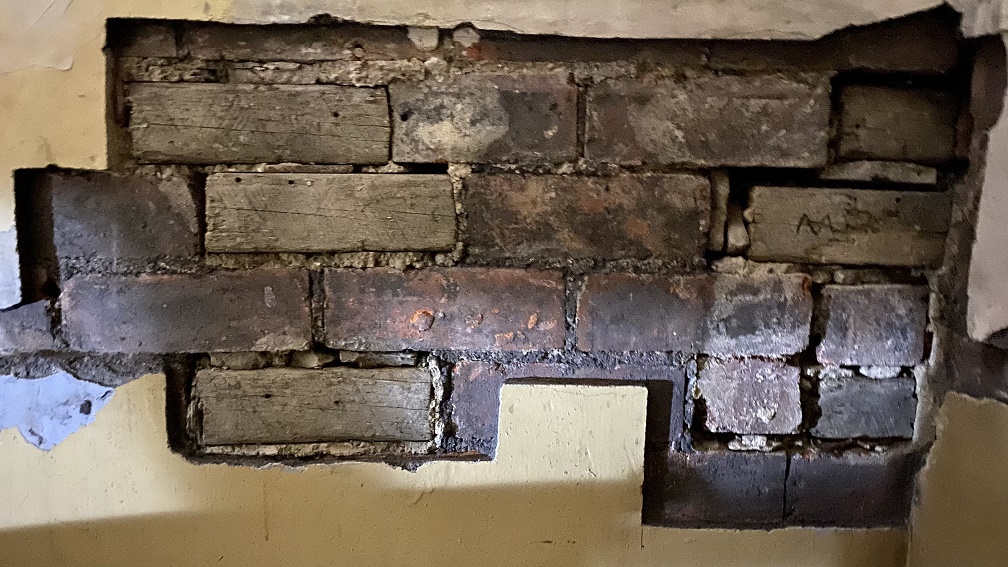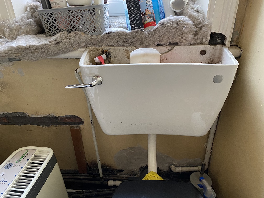 When they installed the current toilet, they chopped into the window cill and squared it off. The cistern was then secured to the squared off section of the window cill.