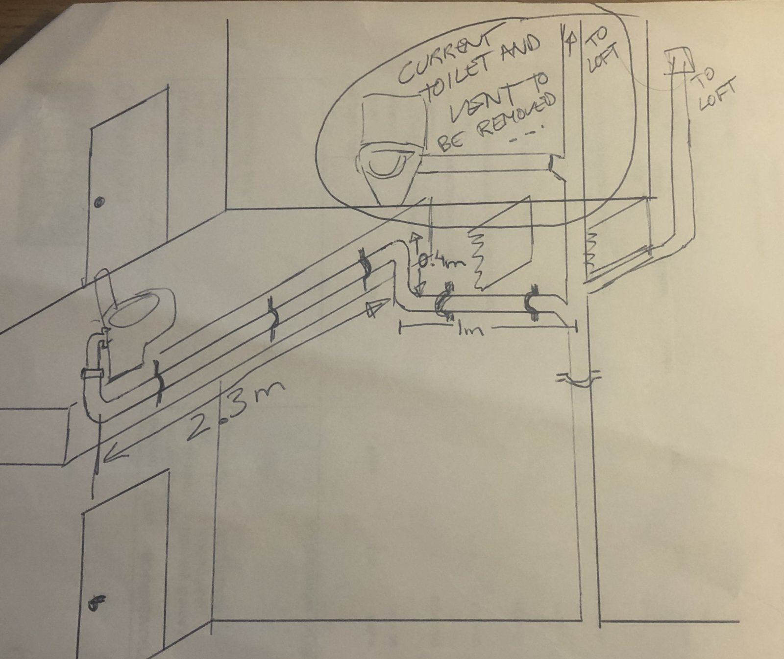 I am moving a toilet across a room. I have had conflicting opinions from two plumbers about soil pipe routing. I upload a dodgy sketch to explain.