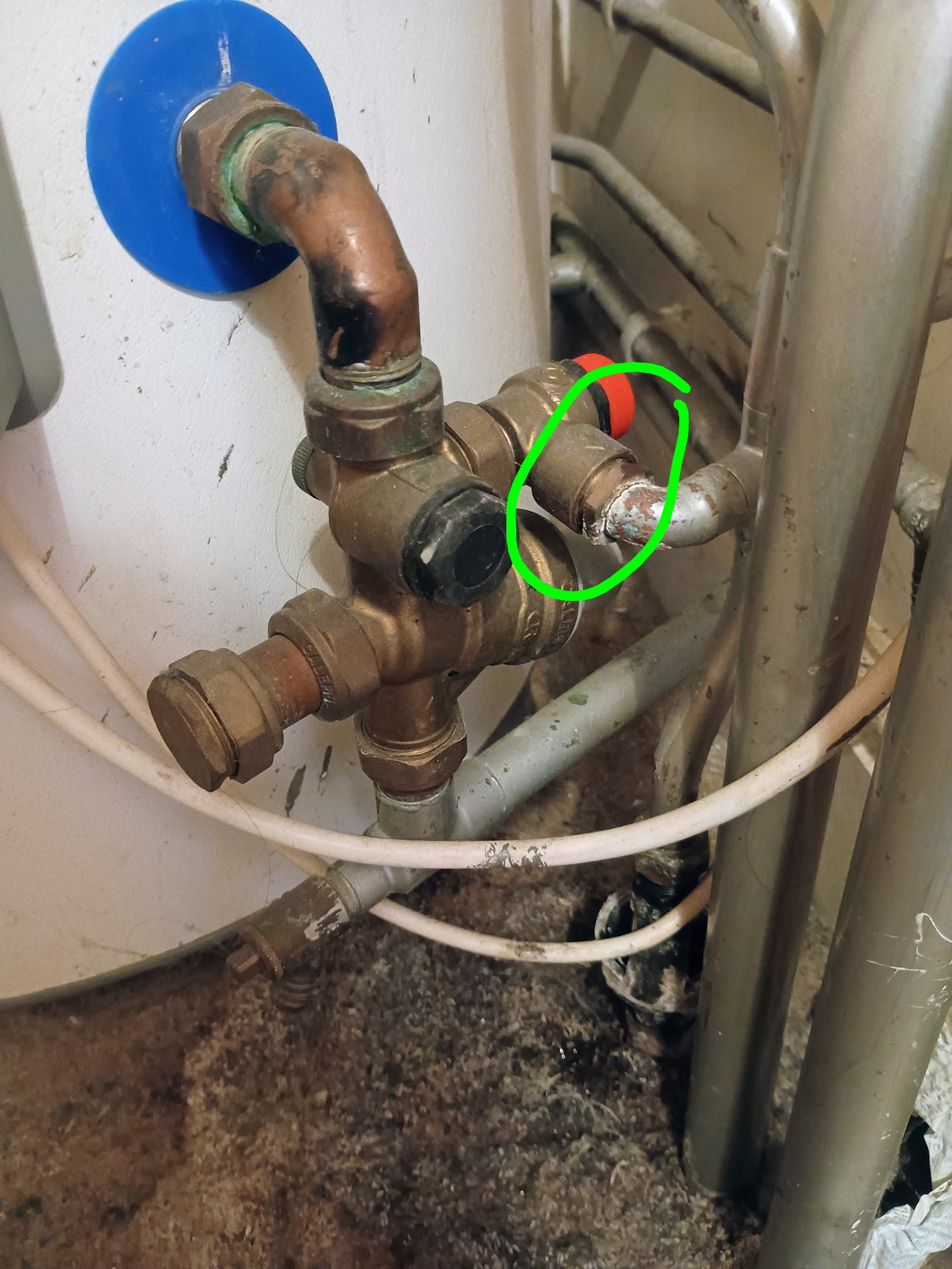 Hi, there is a drip from the multi block whenever the hot water is heating. Recharging the air gap helps a bit, but I want a proper solution. As you can see there is bugger all space.
