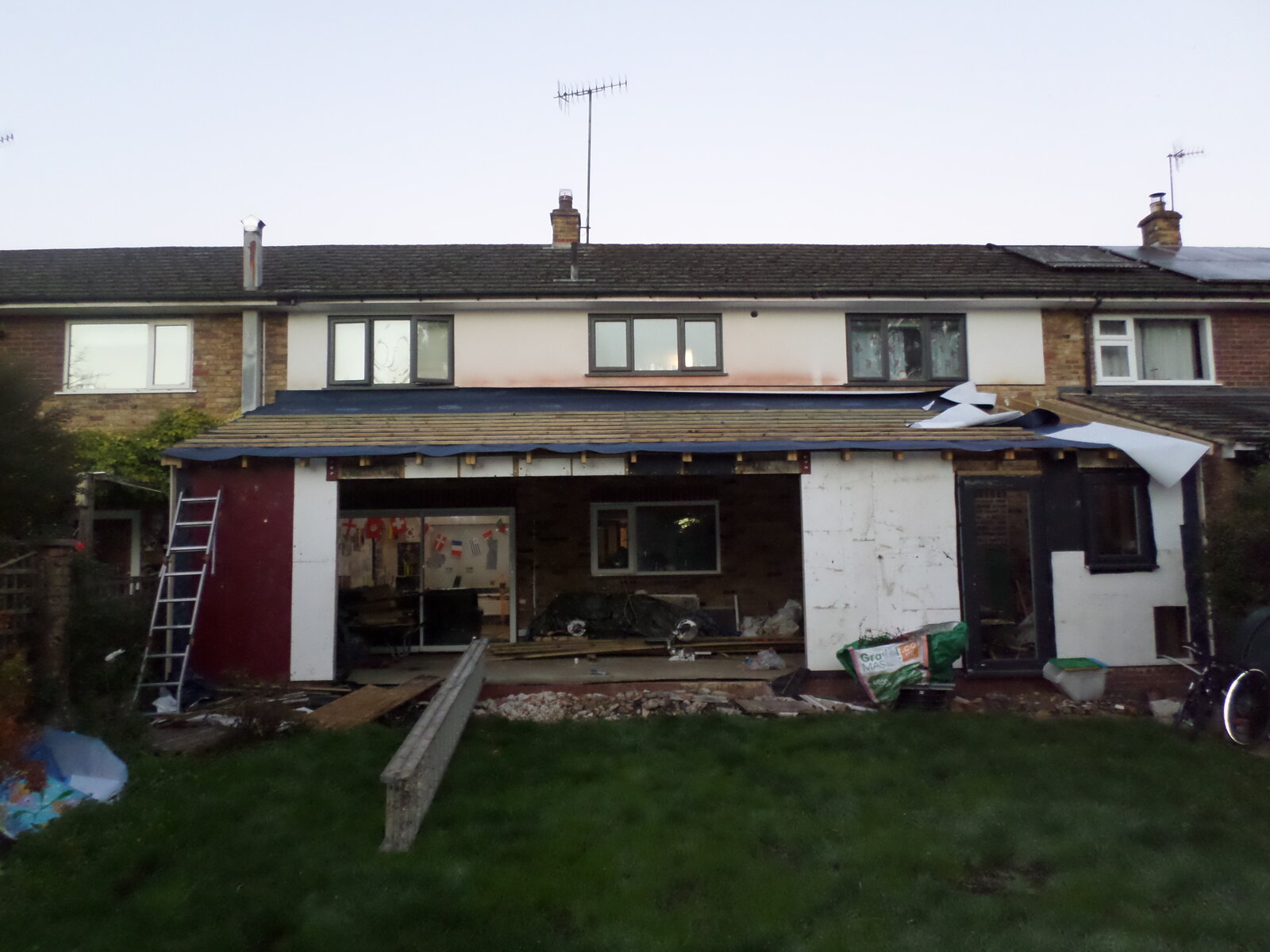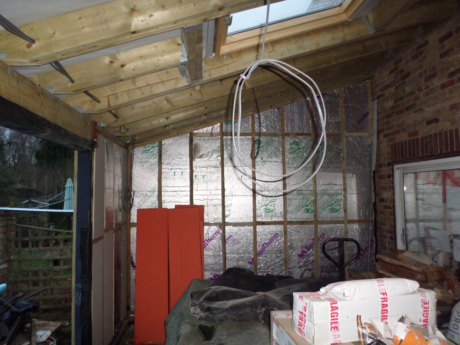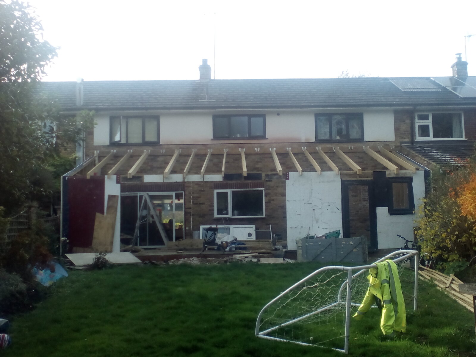Final front panel into position, first door and window in, and a few roof joists into position to restrain the front panels. I was slightly concerned about potential lateral loads on the front panels pulling the joists out of the hangers, so I installed restraint straps behind the ledger board and nailed them to the tops of each joist.