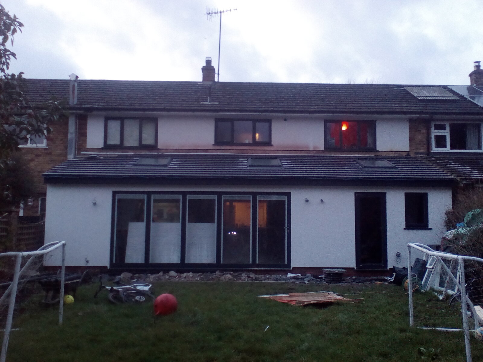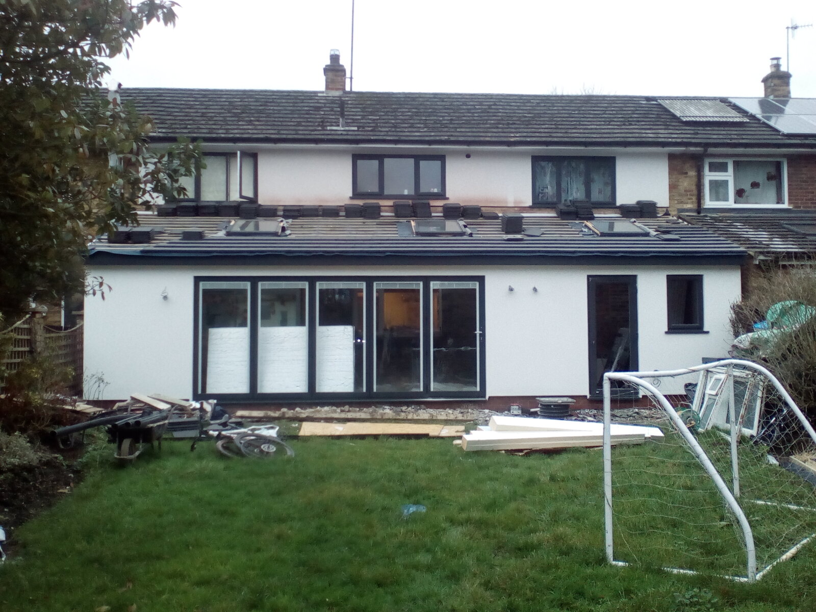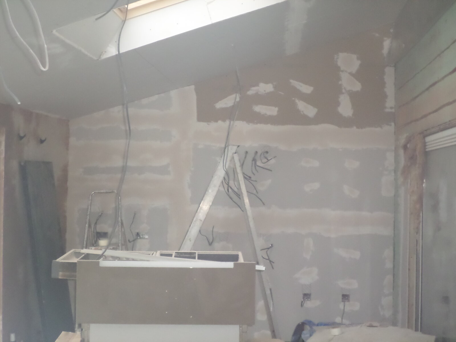 Final front panel into position, first door and window in, and a few roof joists into position to restrain the front panels. I was slightly concerned about potential lateral loads on the front panels pulling the joists out of the hangers, so I installed restraint straps behind the ledger board and nailed them to the tops of each joist.