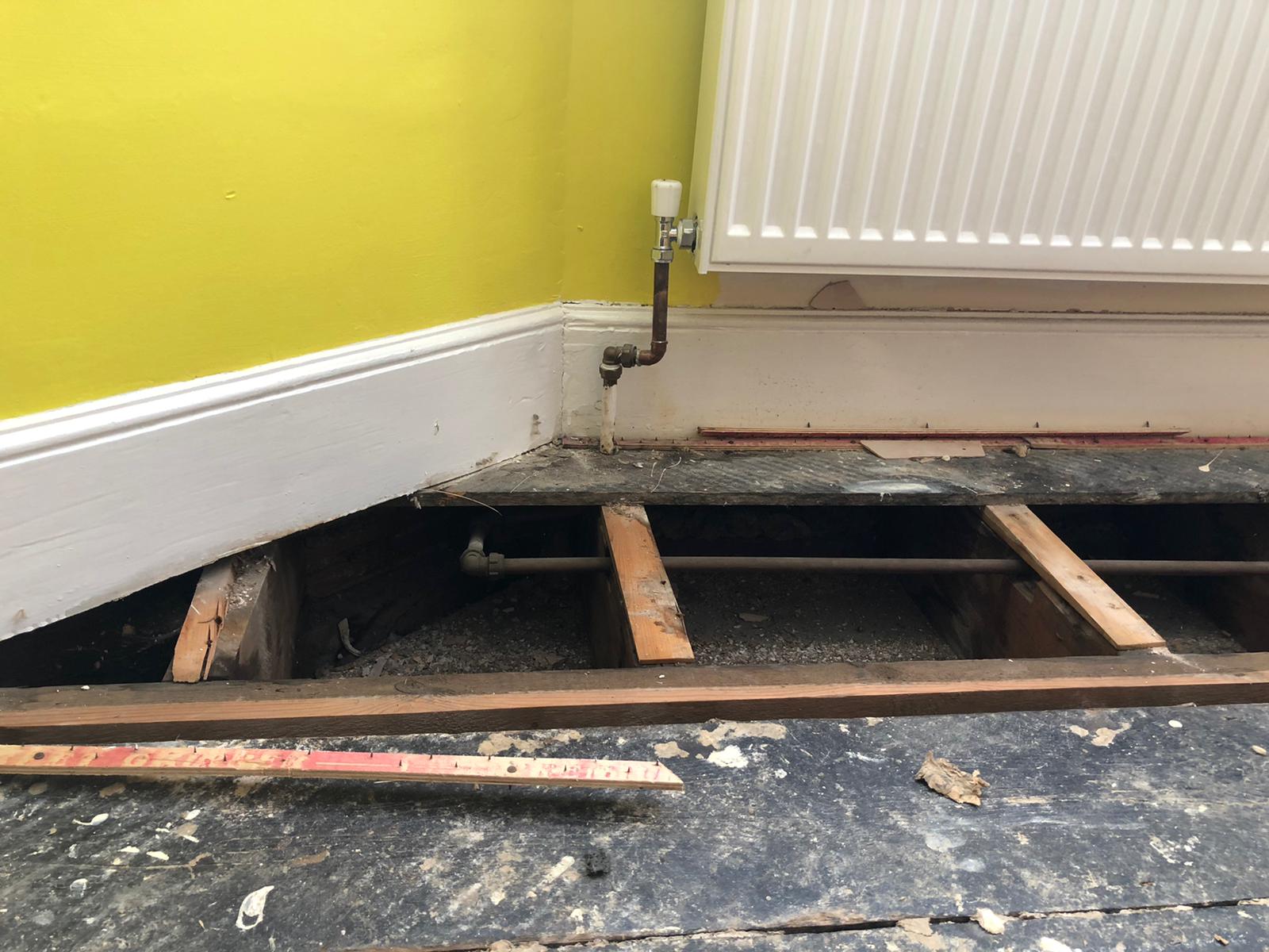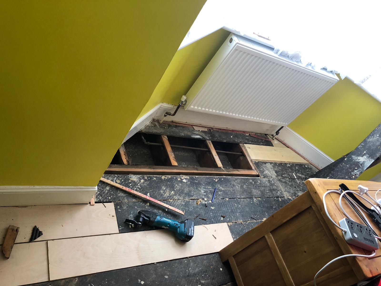 I now had chance to lift floor boards in the top room and can easily identify the dip ness towards the front bay. Joists actually run from rear to front and stops just before the Bay window half hexagon starts. From there a new joists starts to complete the bay which is now coming off and dipped down as you may see in picture. I have over periods noticed some cracks on Bay window and have filled pollyfilla and have not evidenced any new cracks since then.