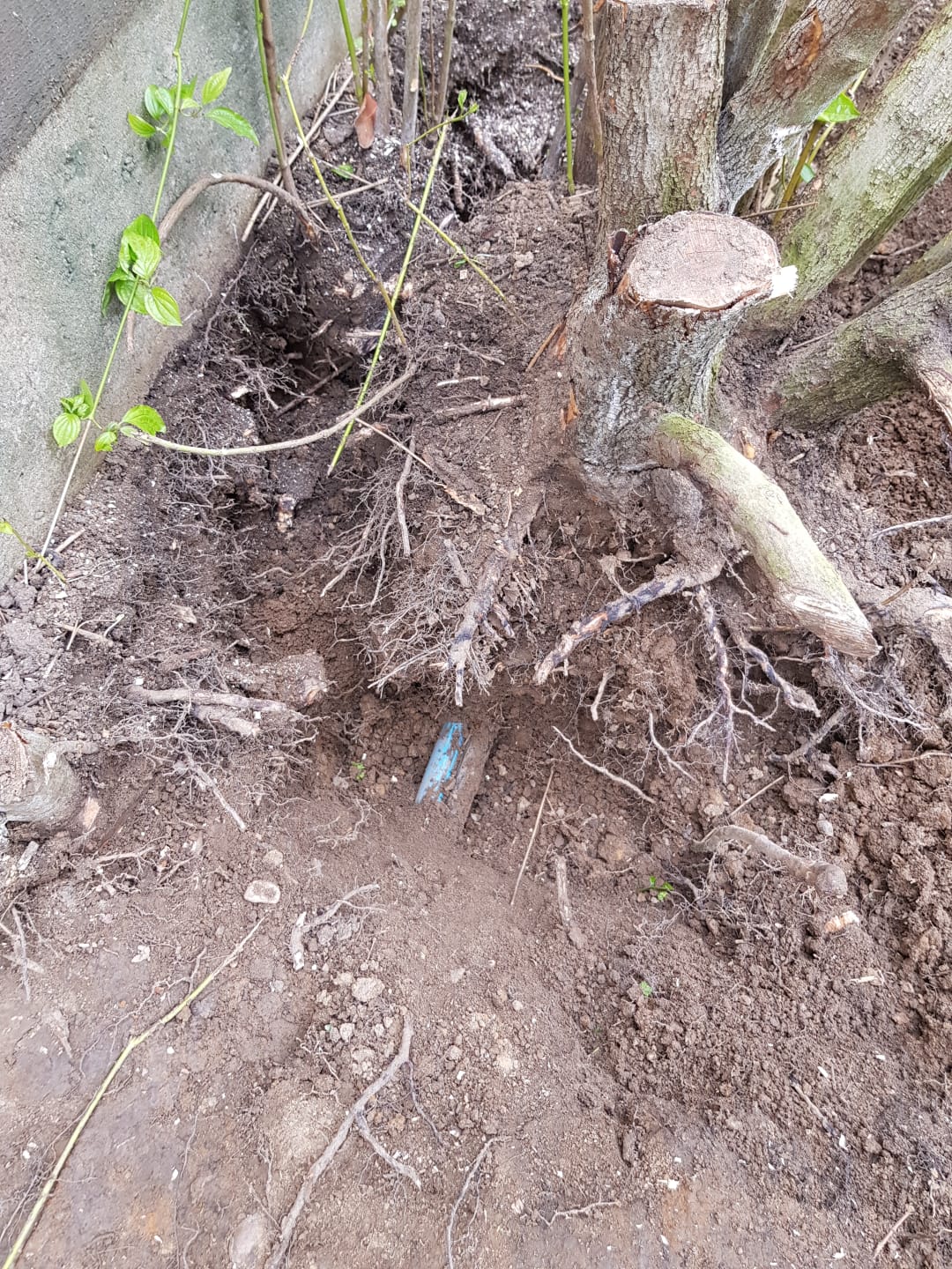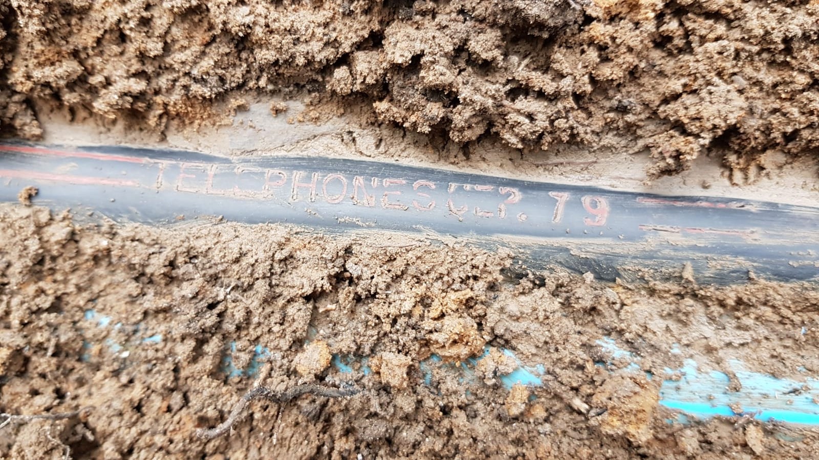 I was removing a tree stump in the back garden and came across what appears to be a blue MDPE pipe and a 1" thick black cable with red stripes and "TELEPHONES UEP. 79" embossed on it.