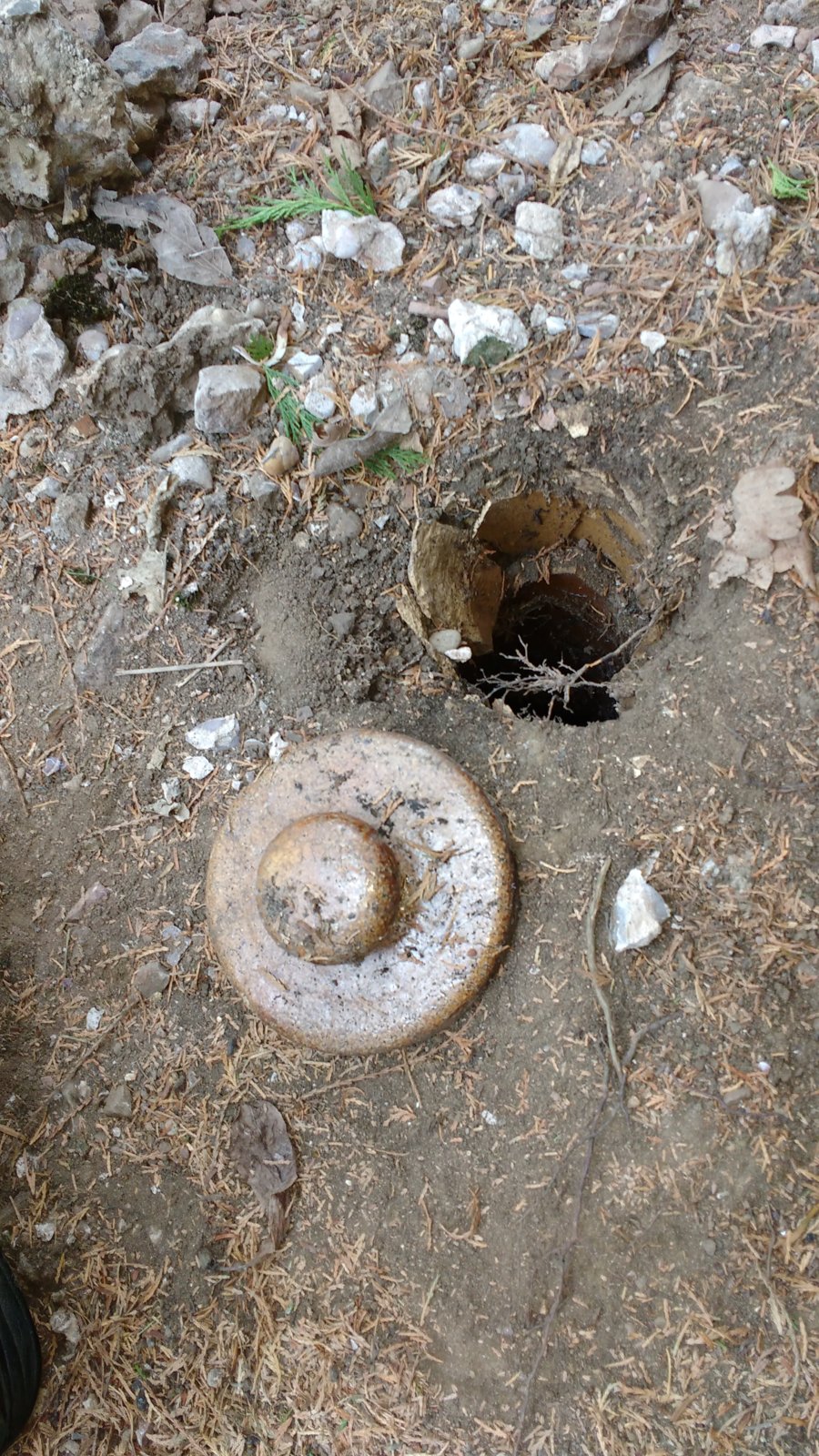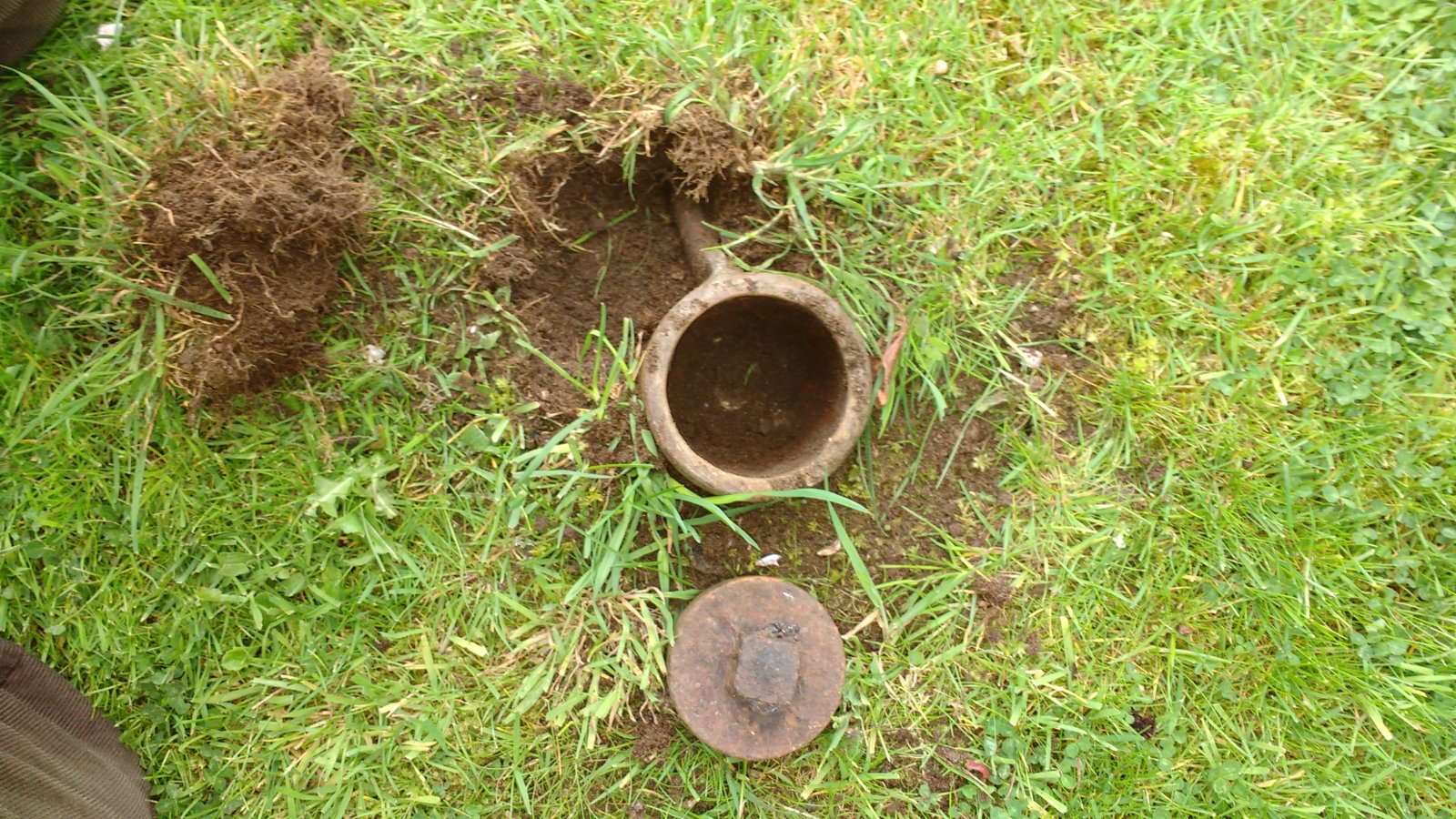 Second is metal with ribs extending out an inch or two. Hole is 2-3 in. dia. The plug does not fit any more (if it ever did). There's something solid under the grass for about 12 in. dia. Seems to have been plugged with concrete about 4 in. down. No idea of age but that sec tion of garden was bought from a neighbour a few decades ago and was previously either allotments or a tennis court (conflicting information).