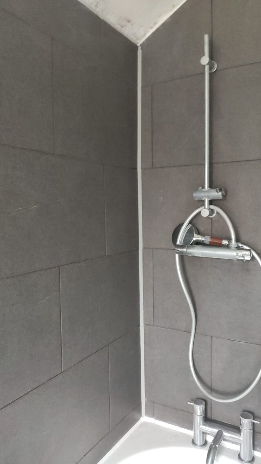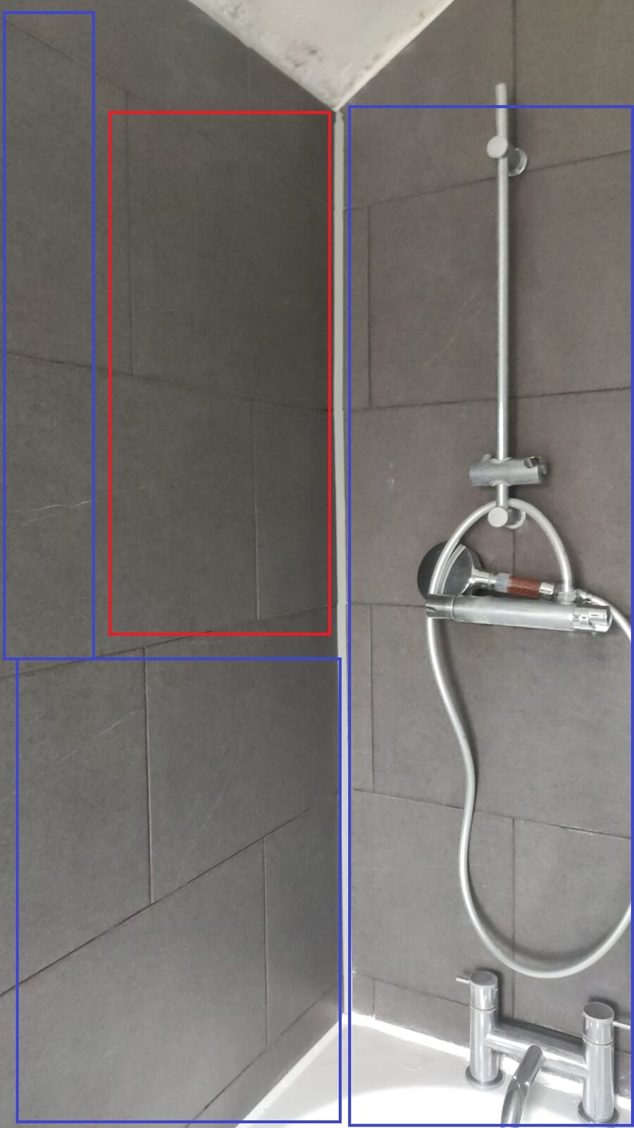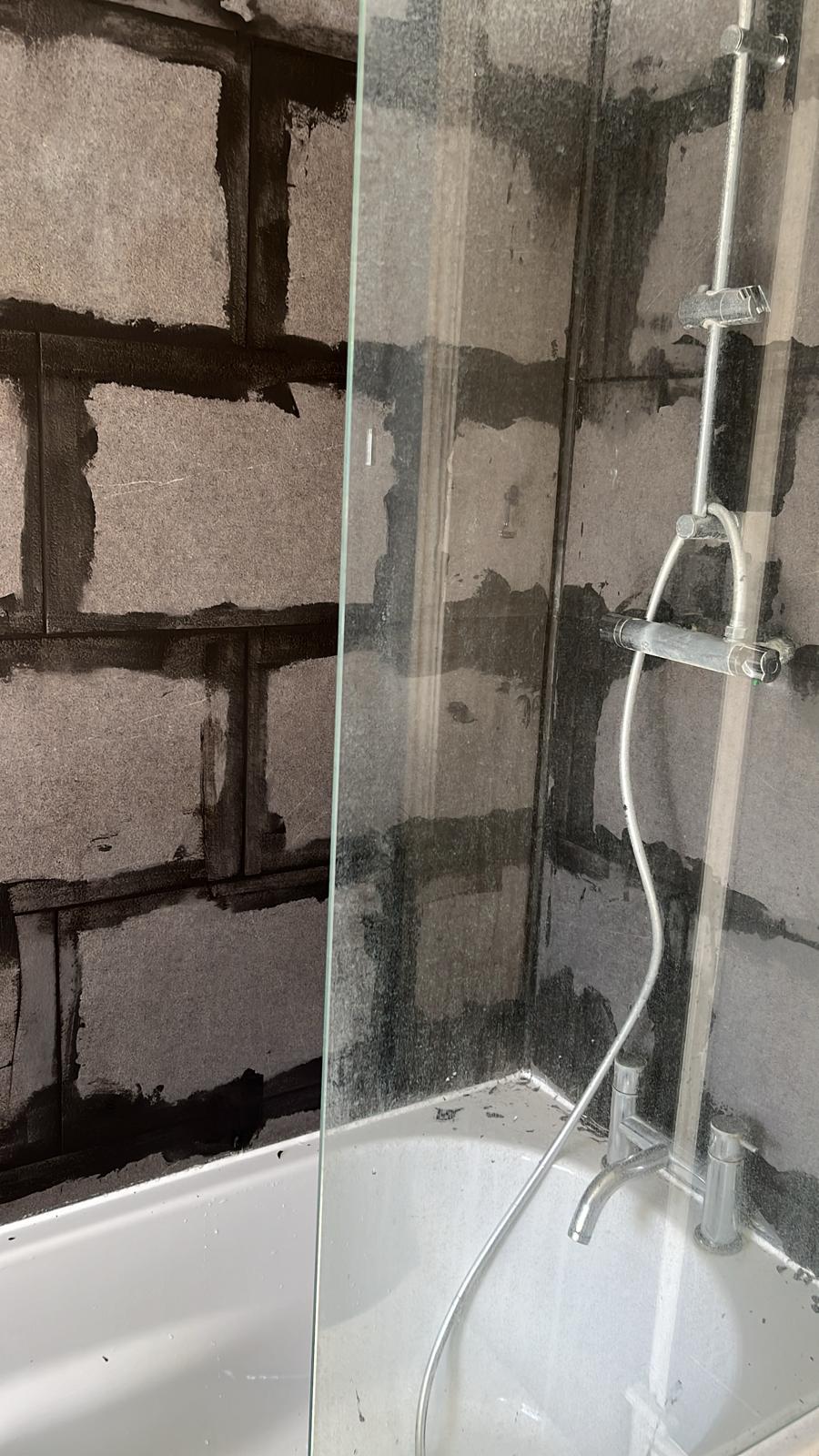 The leak seems to be coming through up the wall. if we shower near the base where it meets the bath, there is no leak. If we shower up the wall it comes out of the bottom like a stream.
