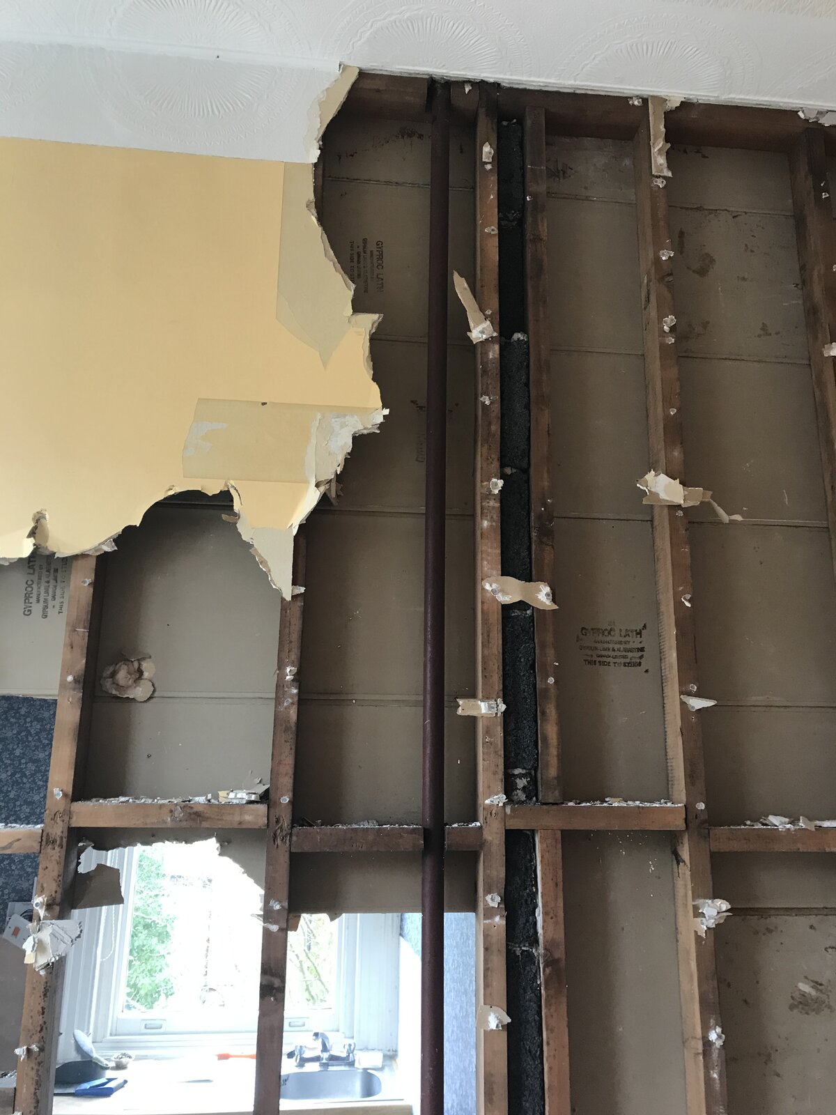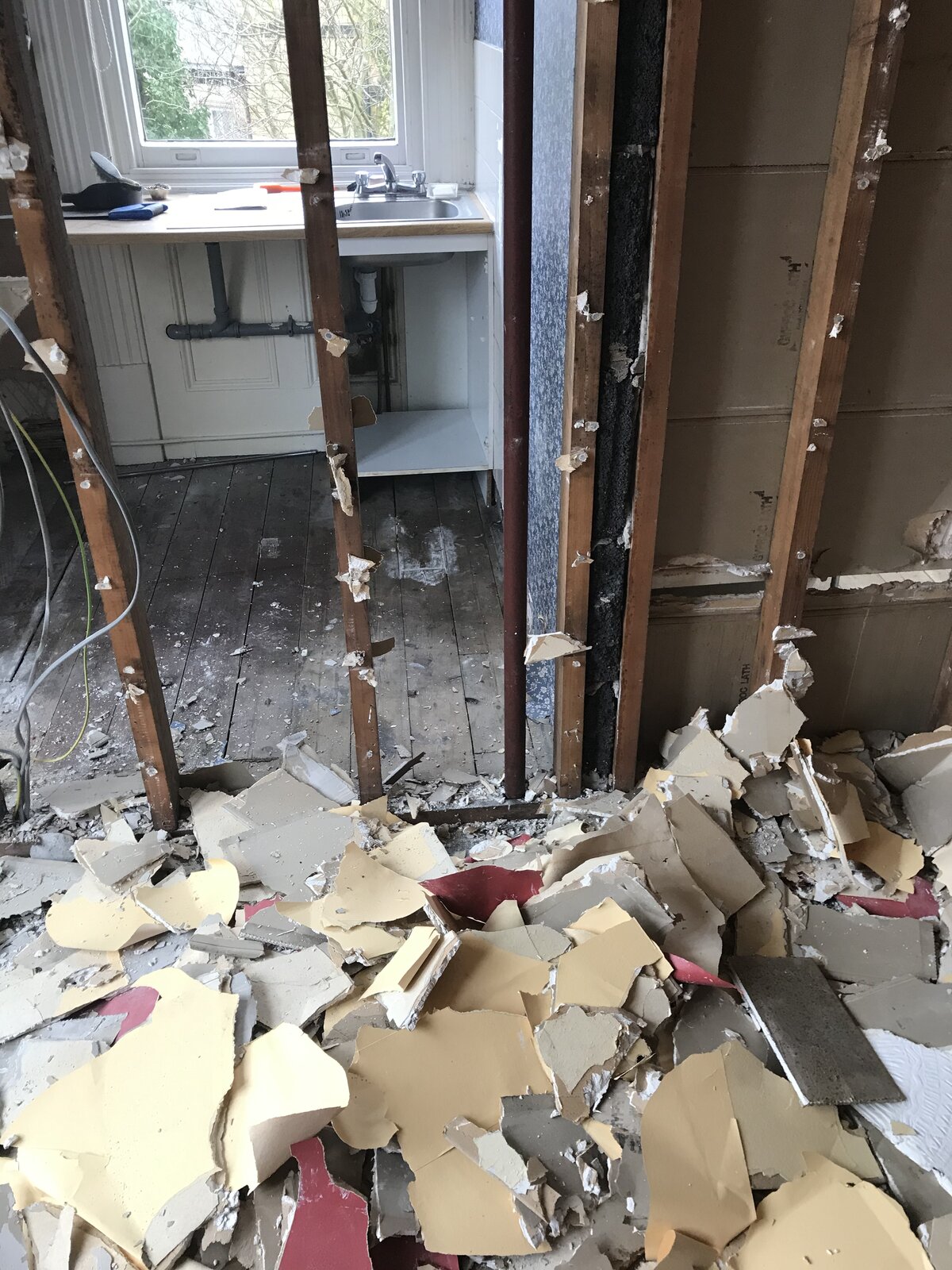Today i was ripping down this stud wall and you can see this pole. It is quite close to the light breeze block wall you can see cut and sandwiched between 2 studs. This wall is the dividing wall between the kitchen and the bathroom.