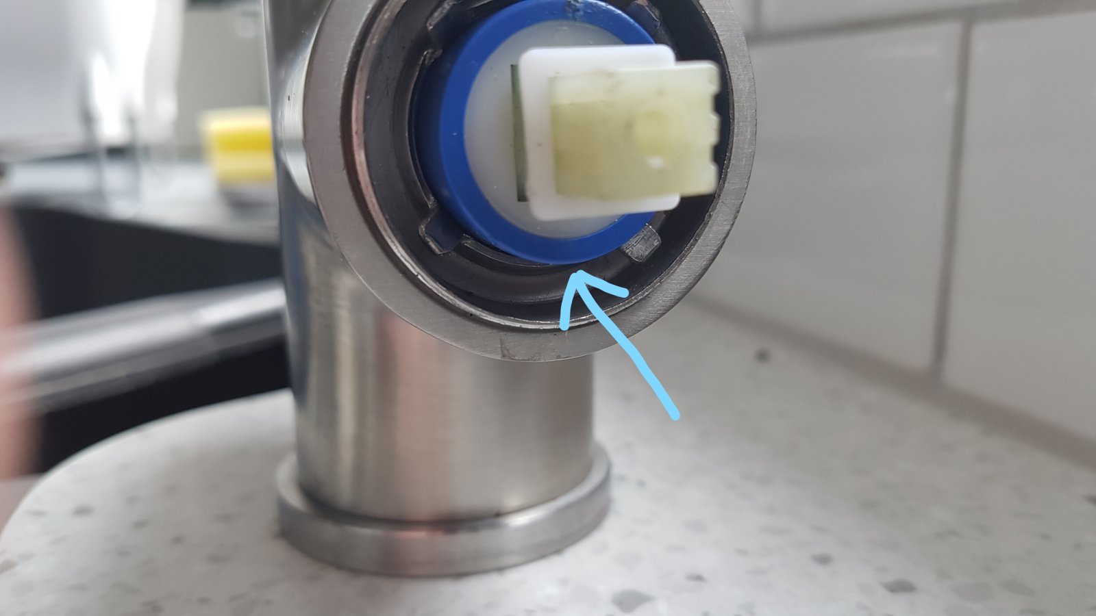 I've recently had a 3-way kitchen tap fitted (hot, cold and filtered). It's been in a week and I've noticed it's weeping slightly from around the edge of the hot/cold tap head. I've taken the tap head apart, hoping to find a loose nut or washer that needed replacing, but I can't see how to adjust or access the part that's leaking. I've attached some pictures, the arrow indicates where it seems to be leaking from (around the blue plastic ring). Has anyone worked on a tap like this before and can anyone advise on how I remove/adjust this to stop the leak? I dont want to start pulling bits apart in case I damage it.