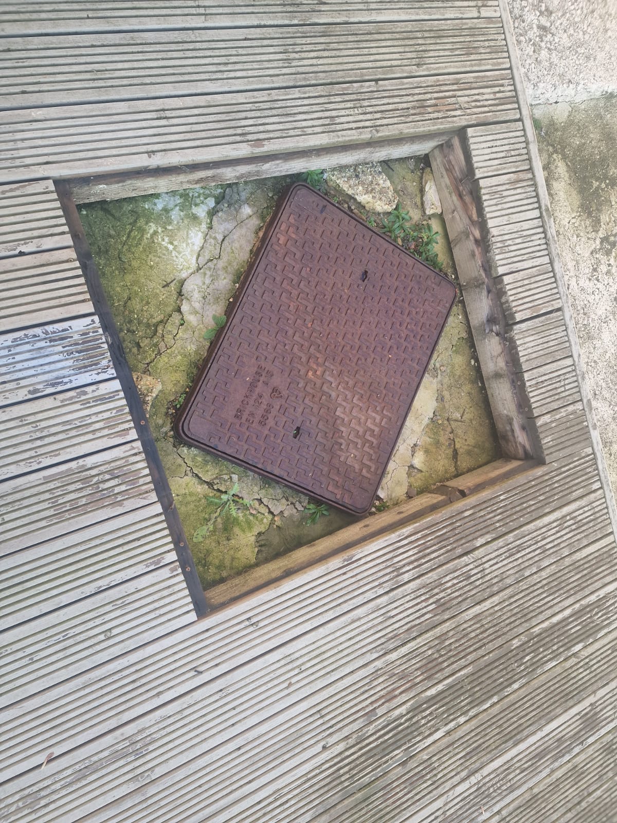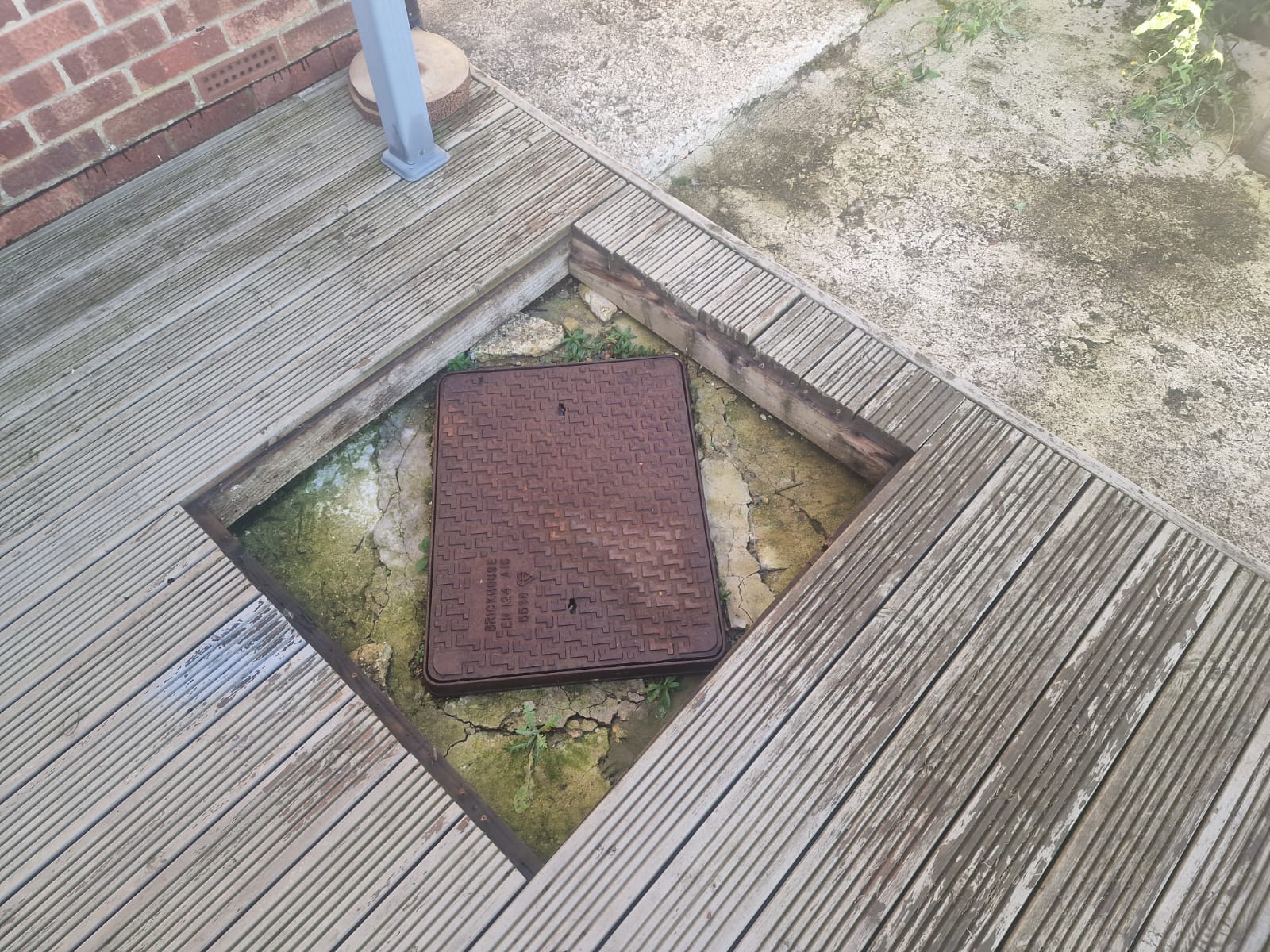 I’m in the process of purchasing a property, and I noticed this manhole cover in the back garden, set under some decking near the house (see attached photos). The cement around the cover is cracked, with some bits even crumbling away, and there’s a bit of vegetation growing through the cracks.