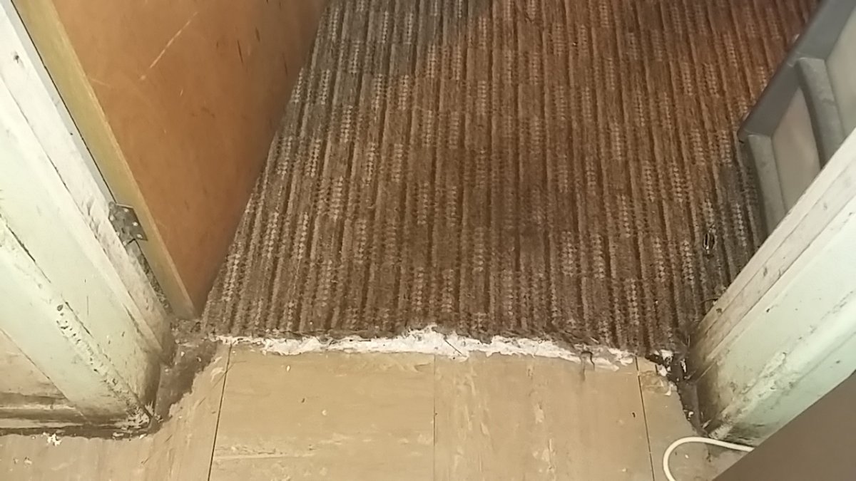 In the picture below you will notice there is glue between the carpet and the tiles. This is to fill a floor gap between the kitchen tiles and living room floor board.